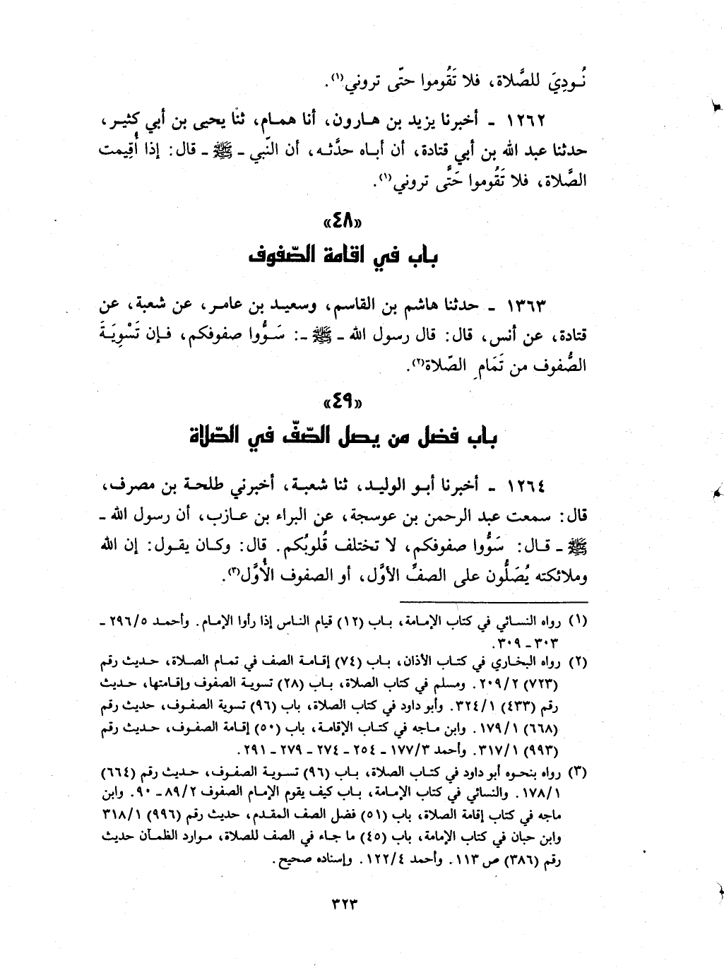 1264 - أخبرنا أبو الوليد ثنا شعبة أخبرني طلحة بن مصرف قال سمعت عبد الرحمن بن عوسجة عن البراء بن عازب ان رسول الله صلى الله عليه و سلم قال : سووا صفوفكم لا تختلف قلوبكم قال وكان يقول إن الله وملائكته يصلون على الصف الأول أو الصفوف الأول