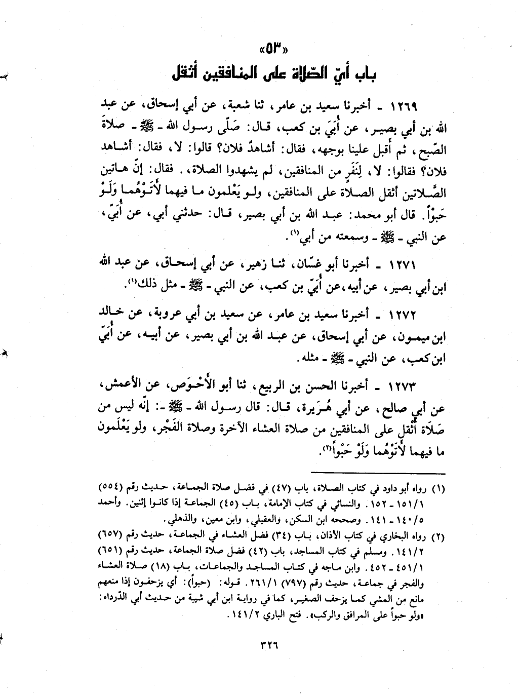 1273 - أخبرنا الحسن بن الربيع ثنا أبو الأحوص عن الأعمش عن أبي صالح عن أبي هريرة قال قال رسول الله صلى الله عليه و سلم : انه ليس من صلاة أثقل على المنافقين من صلاة العشاء الآخرة وصلاة الفجر ولو يعلمون ما فيهما لأتوهما ولو حبوا