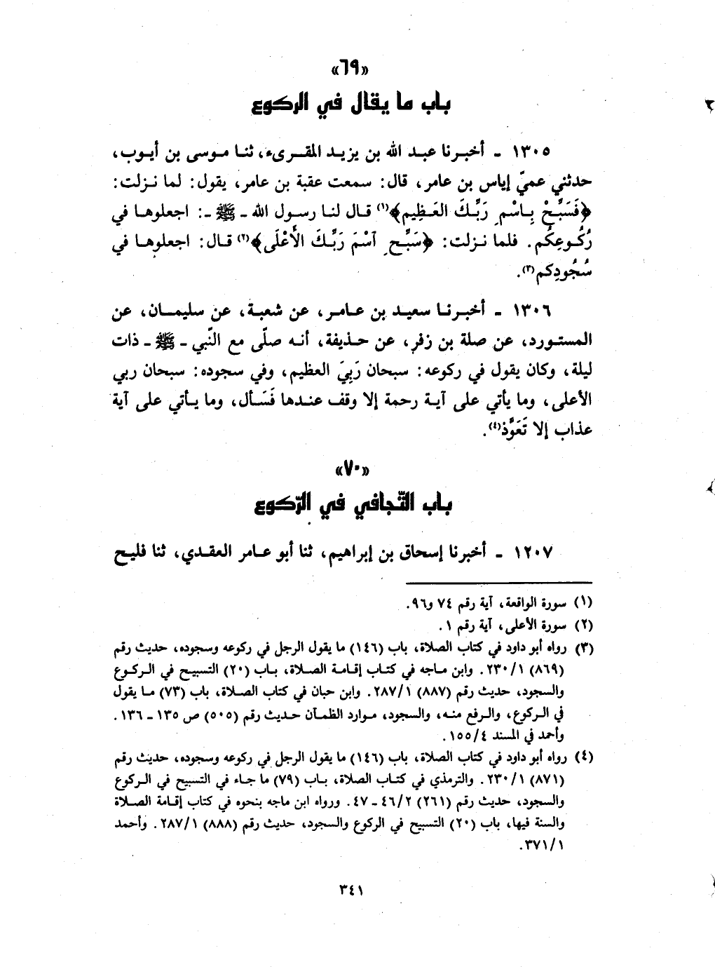 1305 - أخبرنا عبد الله بن يزيد المقرئ ثنا موسى بن أيوب حدثني عمي إياس بن عامر قال سمعت عقبة بن عامر يقول : لما نزلت { فسبح باسم ربك العظيم } قال لنا رسول الله صلى الله عليه و سلم اجعلوها في ركوعكم فلما نزلت { سبح اسم ربك الأعلى } قال اجعلوها في سجودكم