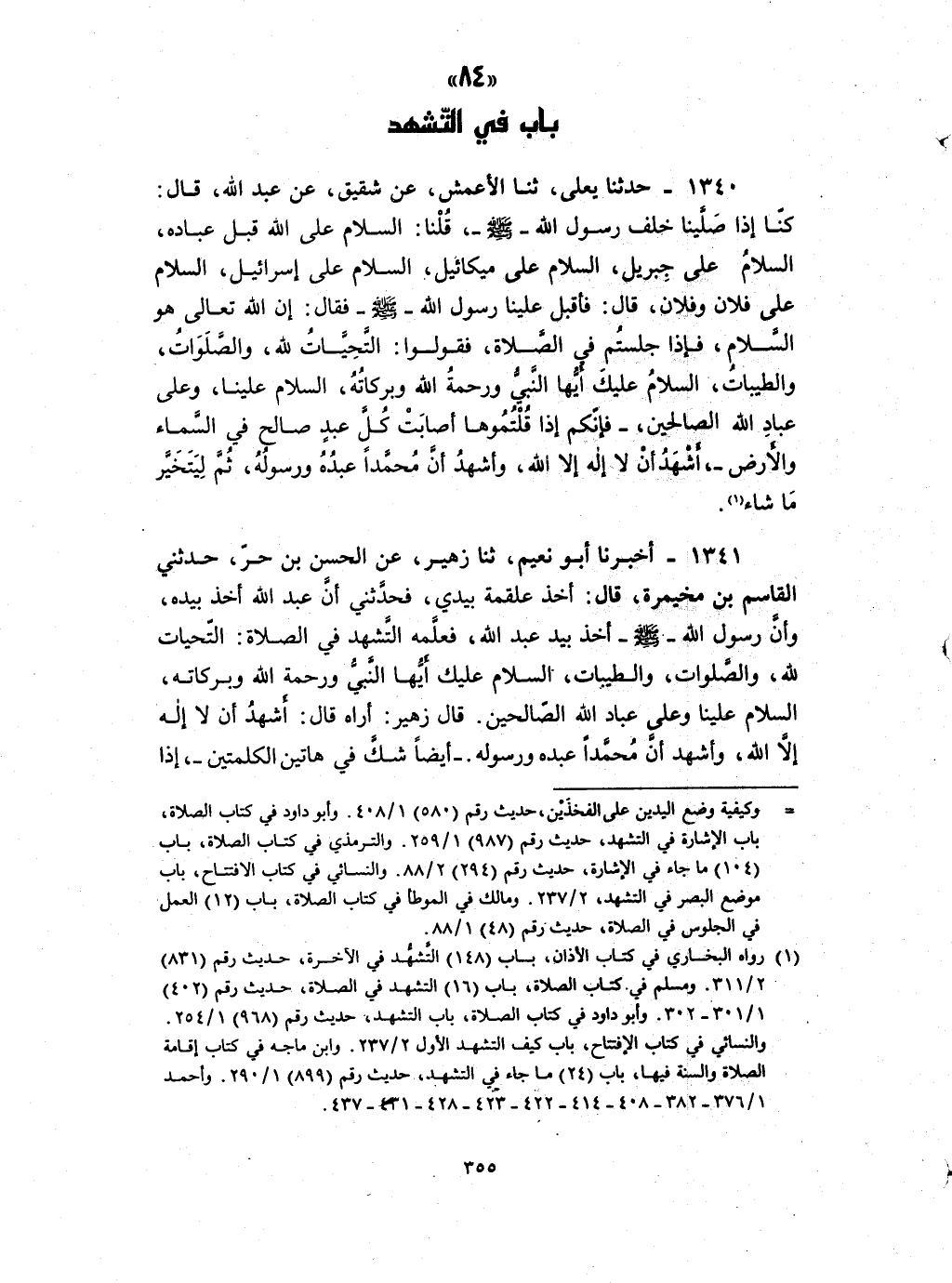 1341 - أخبرنا أبو نعيم ثنا زهير عن الحسن بن حر حدثني القاسم بن مخيمرة قال أخذ علقمة بيدي فحدثني : ان عبد الله أخذ بيده وان رسول الله صلى الله عليه و سلم أخذ بيد عبد الله فعلمه التشهد في الصلاة التحيات لله والصلوات والطيبات السلام عليك أيها النبي ورحمة الله وبركاته السلام علينا وعلى عباد الله الصالحين قال زهير أراه قال أشهد ان لا إله الا الله وأشهد ان محمدا عبده ورسوله أيضا شك في هاتين الكلمتين إذا فعلت هذا أو قضيت فقد قضيت صلاتك ان شئت ان تقوم فقم وان شئت ان تقعد فاقعد