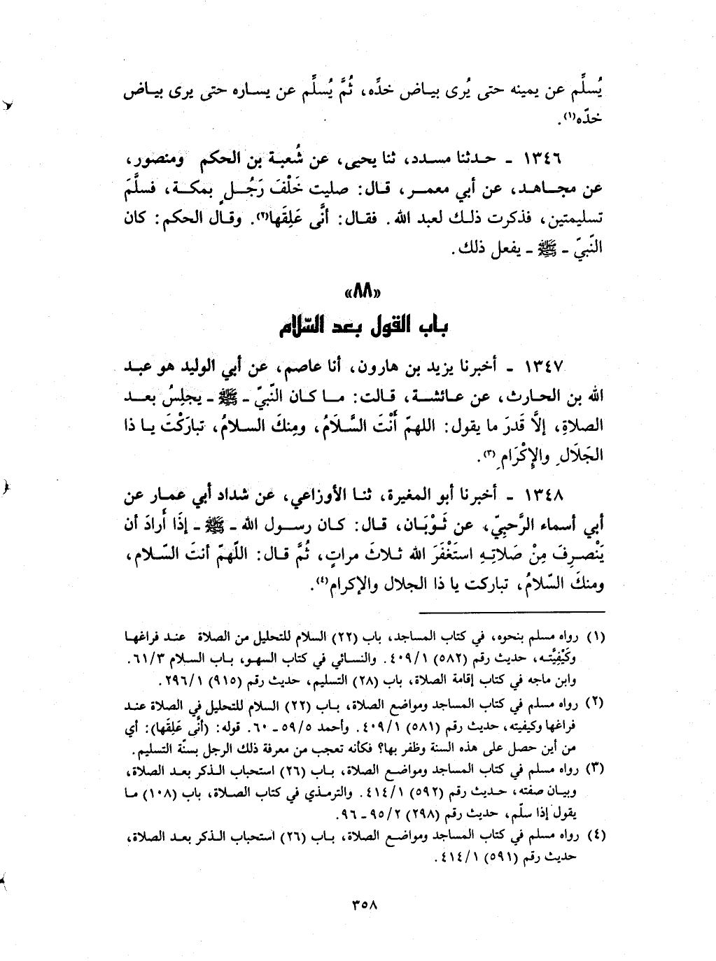 1347 - أخبرنا يزيد بن هارون انا عاصم عن أبي الوليد هو عبد الله بن الحارث عن عائشة قالت : ما كان النبي صلى الله عليه و سلم يجلس بعد الصلاة الا قدر ما يقول اللهم أنت السلام ومنك السلام تباركت ياذا الجلال والإكرام