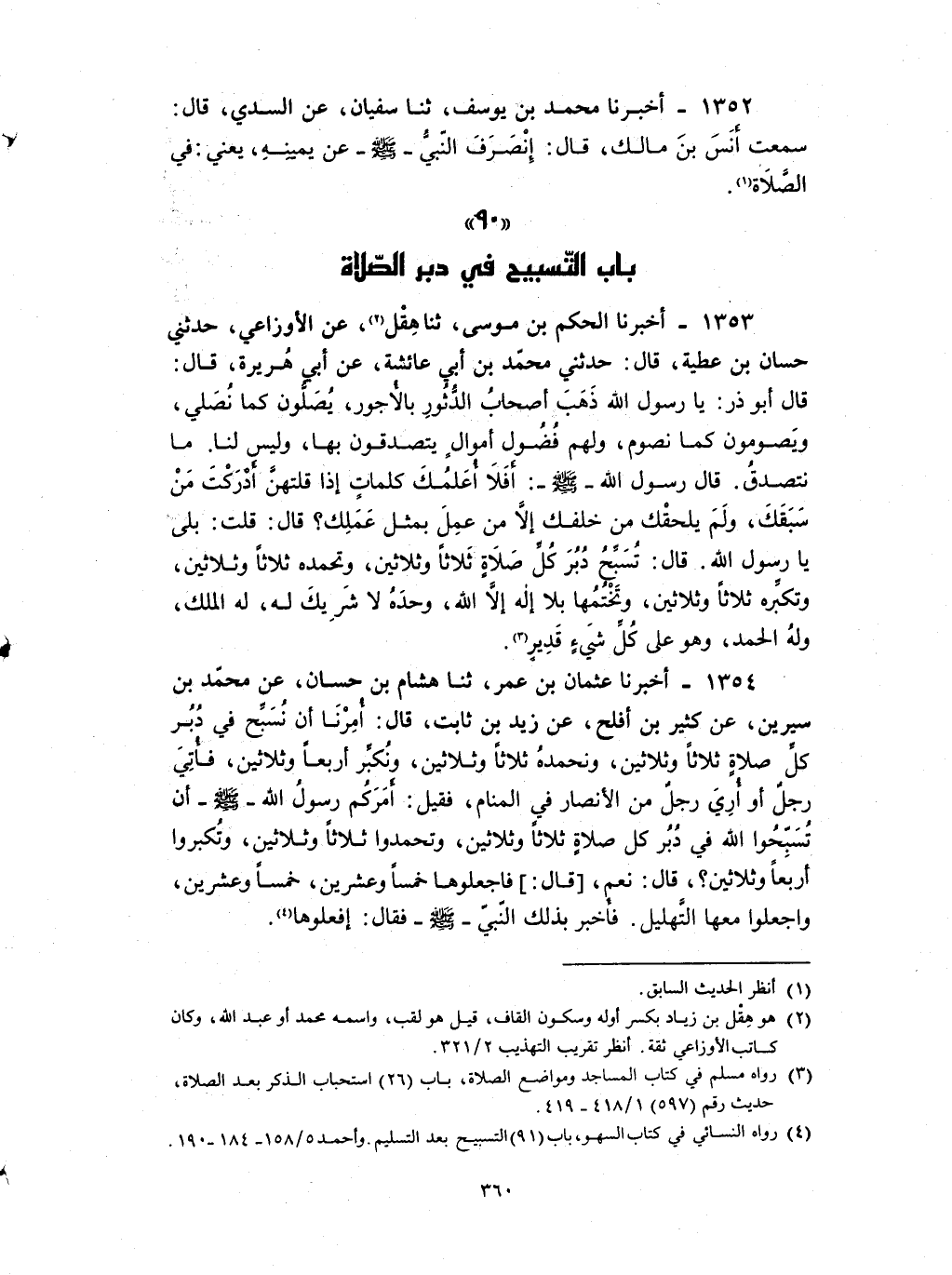 1354 - أخبرنا عثمان بن عمر ثنا هشام بن حسان عن محمد بن سيرين عن كثير بن أفلح عن زيد بن ثابت قال : أمرنا ان نسبح في دبر كل صلاة ثلاثا وثلاثين ونحمده ثلاثا وثلاثين ونكبر أربعا وثلاثين فآتي رجل أو أري رجل من الأنصار في المنام فقيل أمركم رسول الله صلى الله عليه و سلم أن تسبحوا الله في دبر كل صلاة ثلاثا وثلاثين وتحمدوا ثلاثا وثلاثين وتكبروا أربعا وثلاثين قال نعم قال فاجعلوها خمسا وعشرين خمسا وعشرين واجعلوا معها التهليل فأخبر بذلك النبي صلى الله عليه و سلم فقال افعلوها