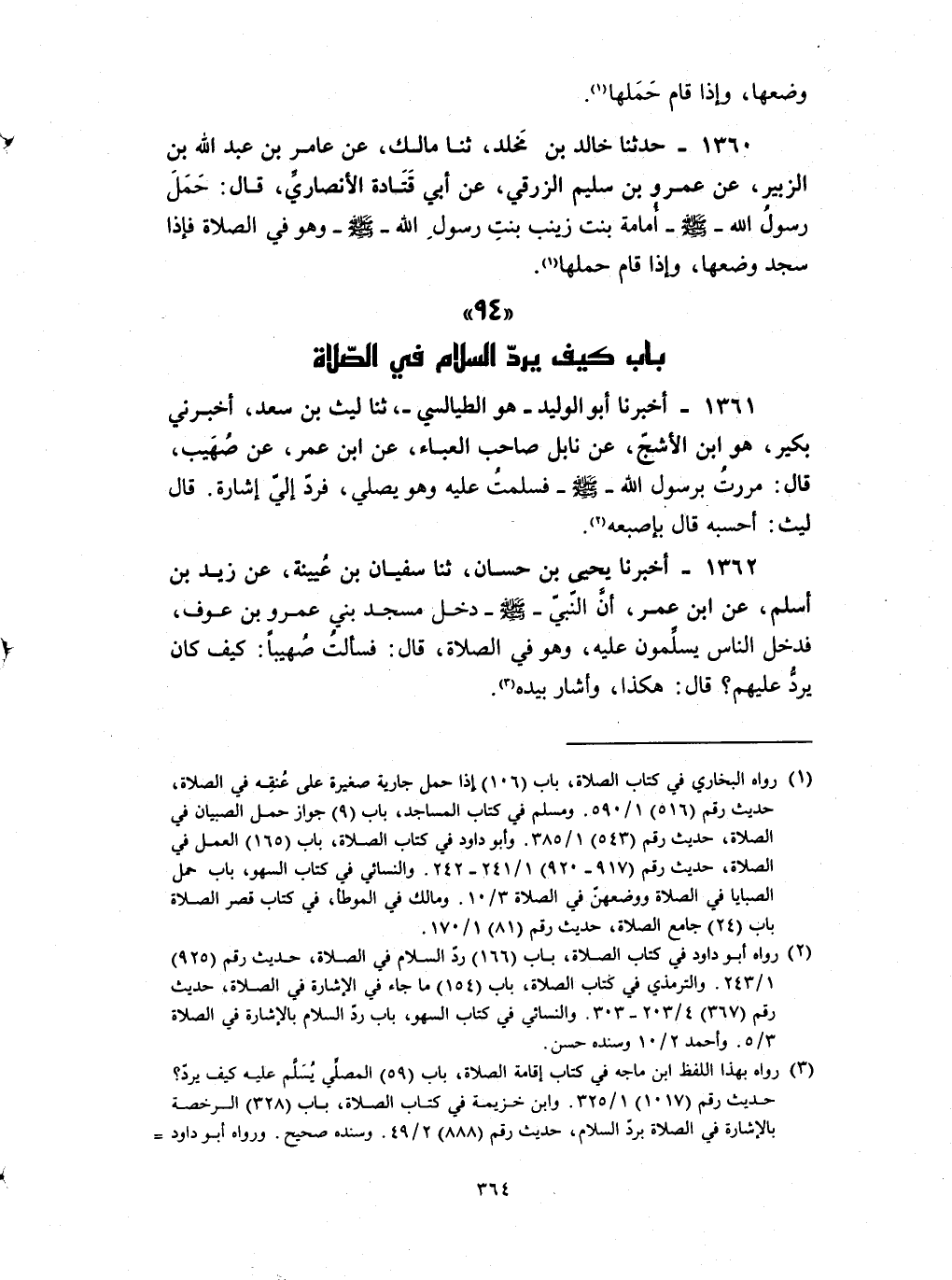 1362 - أخبرنا يحيى بن حسان ثنا سفيان بن عيينة عن زيد بن أسلم عن بن عمر : أن النبي صلى الله عليه و سلم دخل مسجد بني عمرو بن عوف فدخل الناس يسلمون عليه وهو في الصلاة قال فسألت صهيبا كيف كان يرد عليهم قال هكذا وأشار بيده
