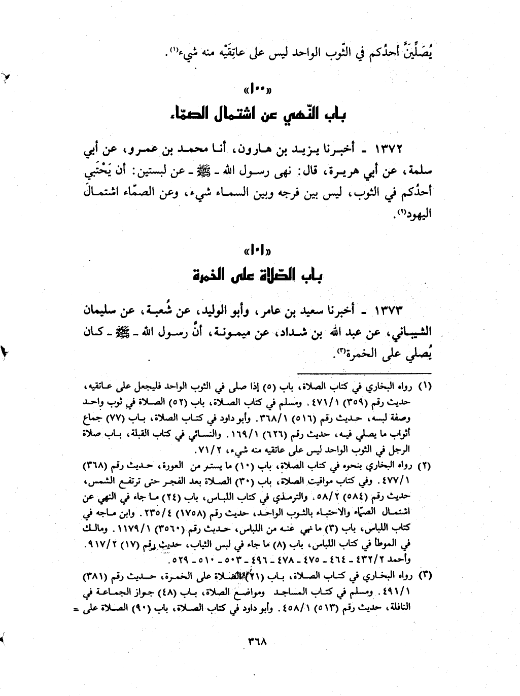 1372 - أخبرنا يزيد بن هارون انا محمد بن عمرو عن أبي سلمة عن أبي هريرة قال : نهى رسول الله صلى الله عليه و سلم عن لبستين ان يحتبي أحدكم في الثوب ليس بين فرجه وبين السماء شيء وعن الصماء اشتمال اليهود