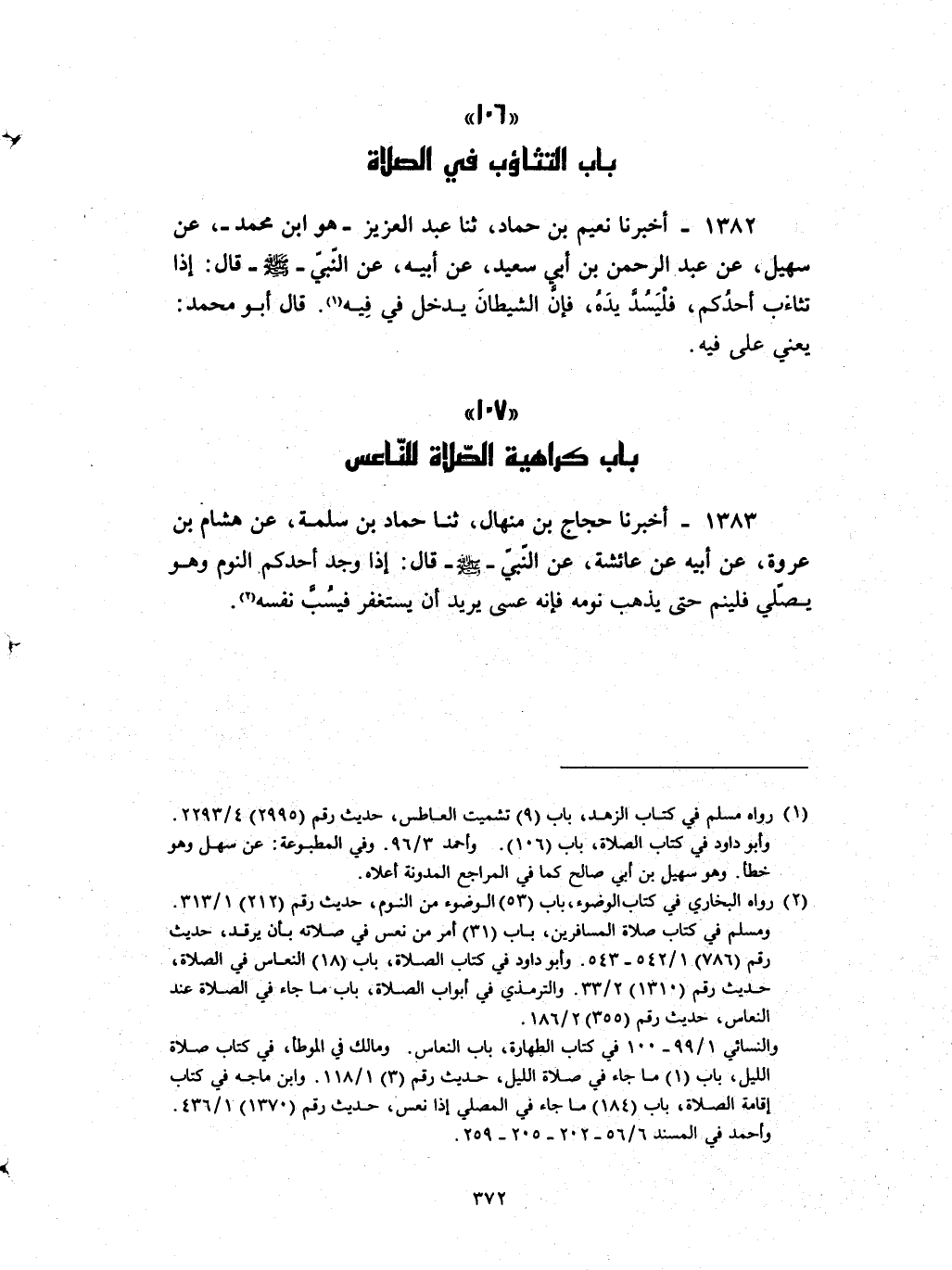 1383 - أخبرنا حجاج بن منهال ثنا حماد بن سلمة عن هشام بن عروة عن أبيه عن عائشة عن النبي صلى الله عليه و سلم قال : إذا وجد أحدكم النوم وهو يصلي فلينم حتى يذهب نومه فإنه عسى يريد ان يستغفر فيسب نفسه