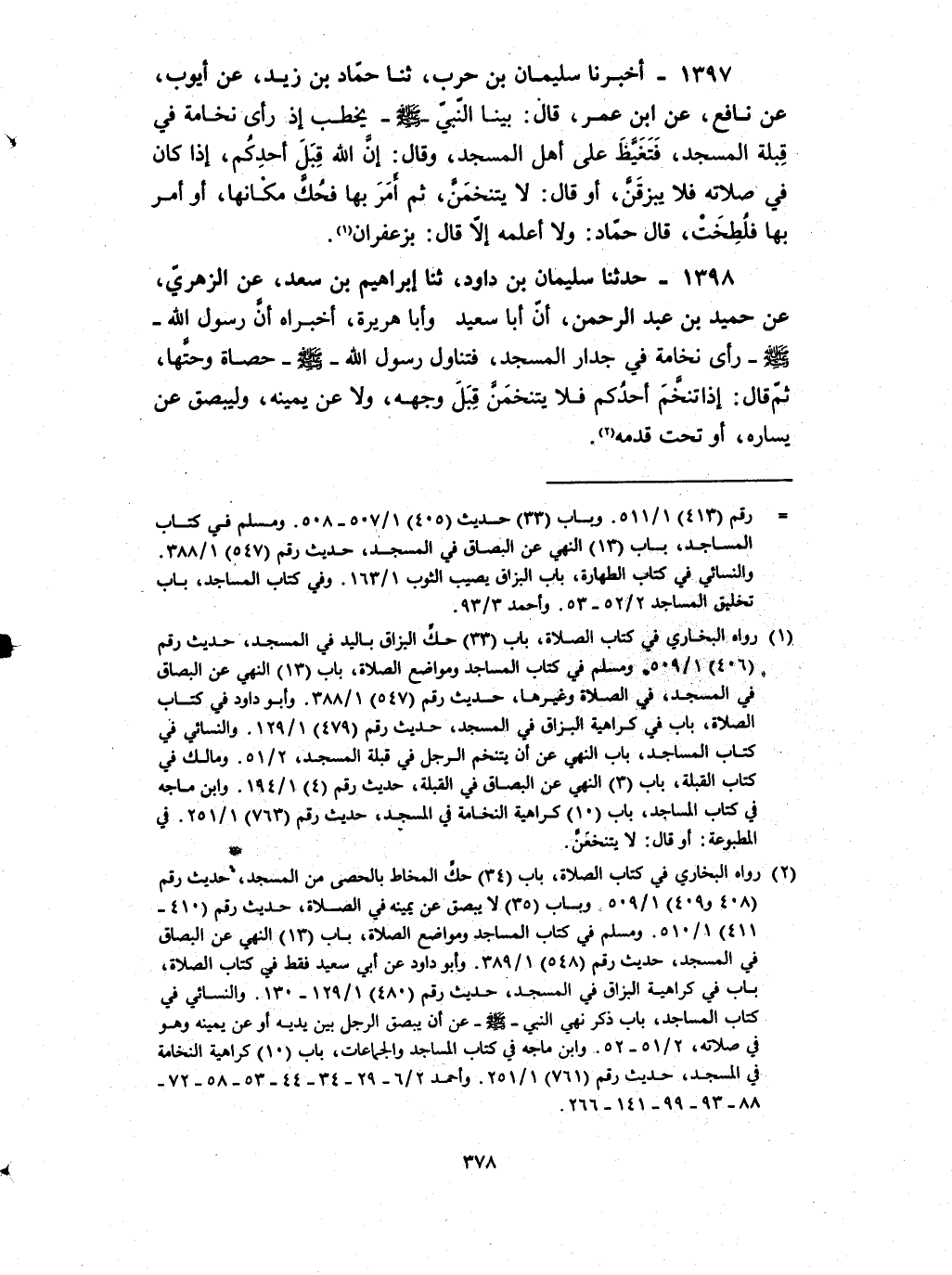 1397 - أخبرنا سليمان بن حرب ثنا حماد بن زيد عن أيوب عن نافع عن بن عمر قال : بينا النبي صلى الله عليه و سلم يخطب إذ رأى نخامة في قبلة المسجد فتغيظ على أهل المسجد وقال إن الله قبل أحدكم إذا كان في صلاته فلا يبزقن أو قال لا يتنخمن ثم أمر بها فحك مكانها أو أمر به فلطخت قال حماد ولا أعلمه إلا قال بزعفران