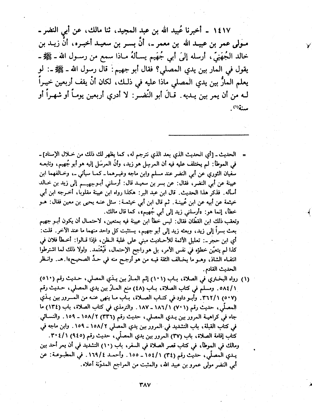 1417 - أخبرنا عبيد الله بن عبد المجيد ثنا مالك عن أبي النضر مولى عمر بن عبيد الله بن معمر ان بسر بن سعيد أخبره : ان زيد بن خالد الجهني أرسله إلى أبي جهيم يسأله ماذا سمع من رسول الله صلى الله عليه و سلم يقول في المار بين يدي المصلي فقال أبو جهيم قال رسول الله صلى الله عليه و سلم لو يعلم المار بين يدي المصلي ماذا عليه في ذلك لكان ان يقف أربعين خيرا له من ان يمر بين يديه قال أبو النضر لا أدري أربعين يوما أو شهرا أو سنة