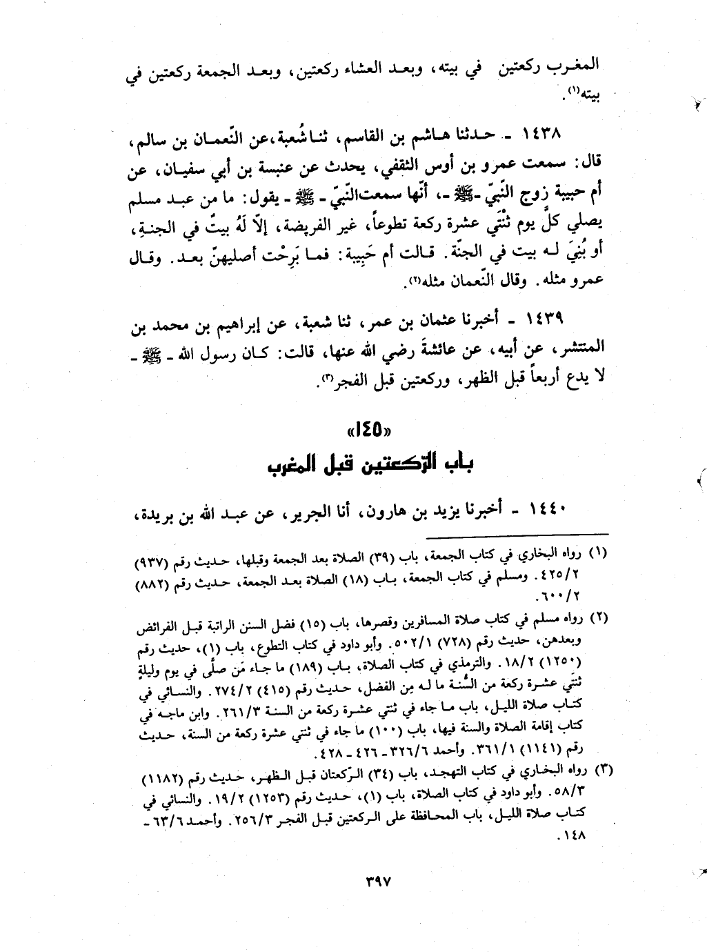 1438 - حدثنا هاشم بن القاسم ثنا شعبة عن النعمان بن سالم قال سمعت عمرو بن أوس الثقفي يحدث عن عنبسة بن أبي سفيان عن أم حبيبة زوج النبي صلى الله عليه و سلم انها سمعت النبي صلى الله عليه و سلم يقول : ما من عبد مسلم يصلي كل يوم ثنتي عشرة ركعة تطوعا غير الفريضة إلا له بيت في الجنة أو بني له بيت في الجنة قالت أم حبيبة فما برحت أصليهن بعد وقال عمرو مثله وقال النعمان مثله