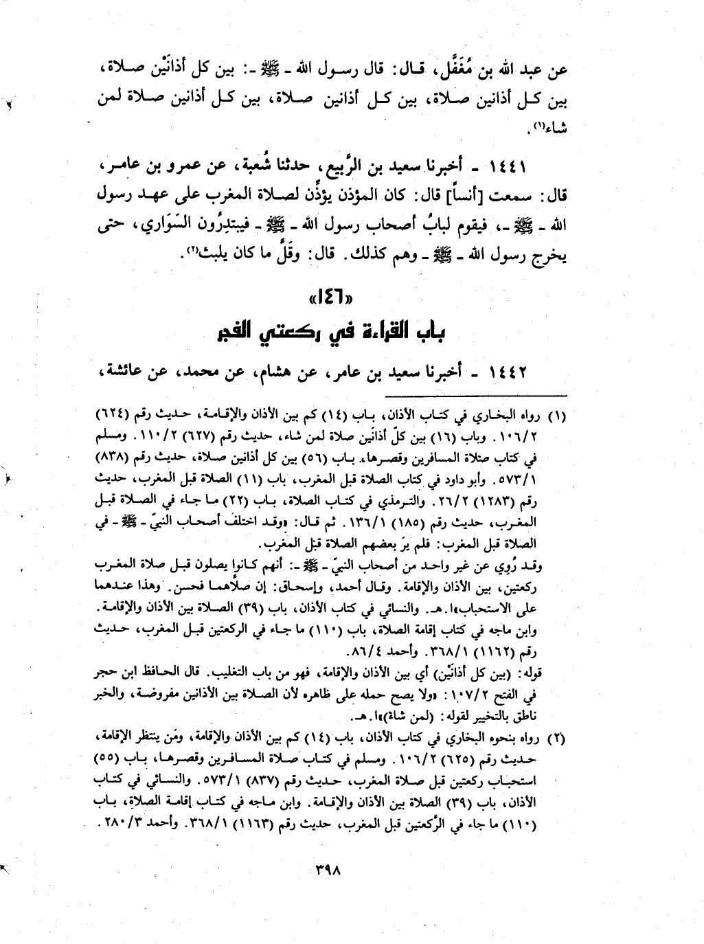 1441 - أخبرنا سعيد بن الربيع حدثنا شعبة عن عمرو بن عامر قال سمعت أنسا قال : كان المؤذن يؤذن لصلاة المغرب على عهد رسول الله صلى الله عليه و سلم فيقوم لباب أصحاب رسول الله صلى الله عليه و سلم فيبتدرون السواري حتى يخرج رسول الله صلى الله عليه و سلم وهم كذلك قال وقل ما كان يلبث