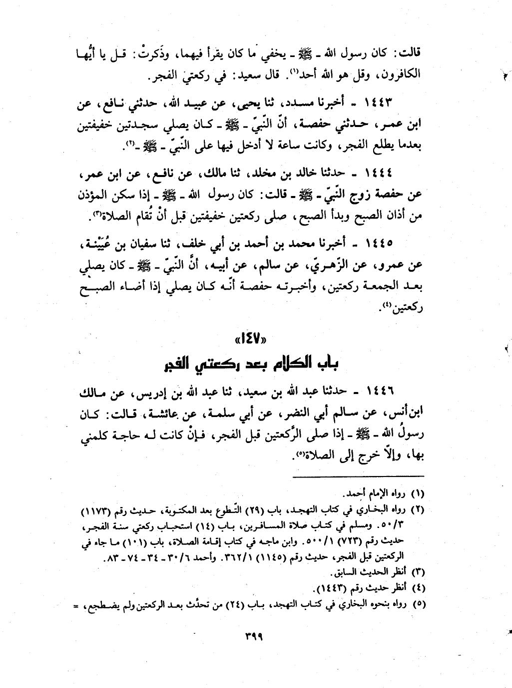 1444 - حدثنا خالد بن مخلد ثنا مالك عن نافع عن بن عمر عن حفصة زوج النبي صلى الله عليه و سلم قالت : كان رسول الله صلى الله عليه و سلم إذا سكن المؤذن من أذان الصبح وبدأ الصبح صلى ركعتين خفيفتين قبل ان تقام الصلاة