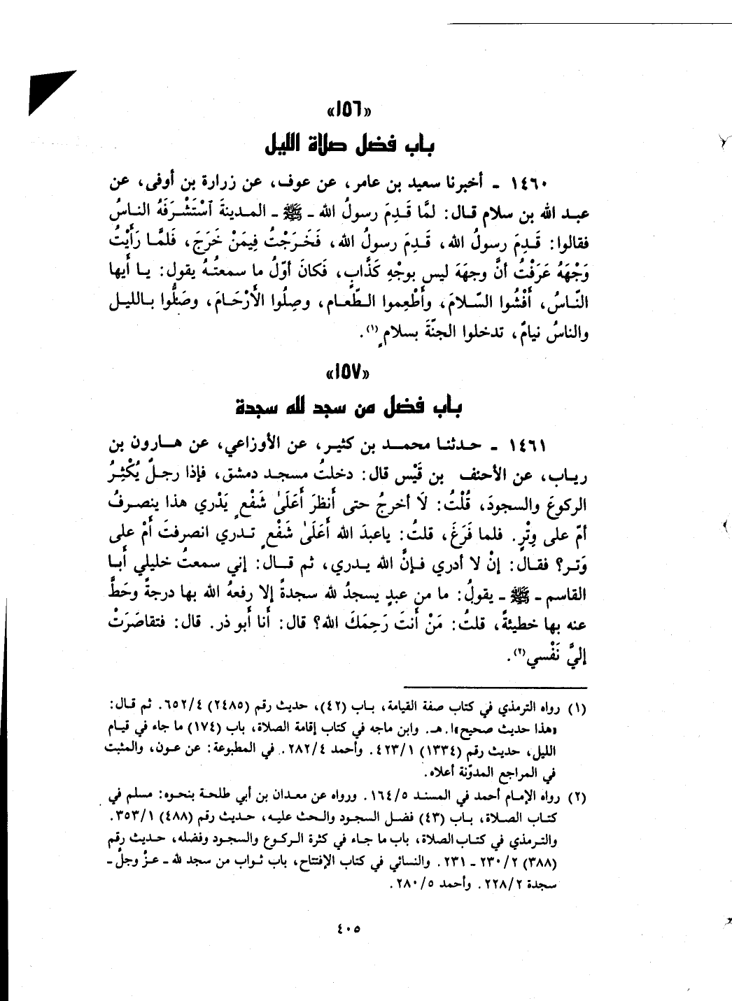 1460 - أخبرنا سعيد بن عامر عن عوف عن زرارة بن أوفى عن عبد الله بن سلام قال : لما قدم رسول الله صلى الله عليه و سلم المدينة استشرفه الناس فقالوا قدم رسول الله قدم رسول الله فخرجت فيمن خرج فلما رأيت وجهه عرفت ان وجهه ليس بوجه كذاب فكان أول ما سمعته يقول يا أيها الناس أفشوا السلام وأطعموا الطعام وصلوا الأرحام وصلوا بالليل والناس نيام تدخلوا الجنة بسلام