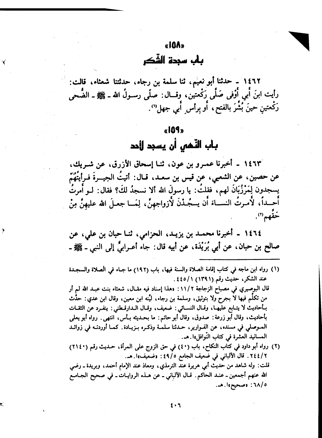 1463 - أخبرنا عمرو بن عون ثنا إسحاق الأزرق عن شريك عن حصين عن الشعبي عن قيس بن سعد قال : أتيت الحيرة فرأيتهم يسجدون لمرزبان لهم فقلت يا رسول الله الا نسجد لك فقال لو أمرت أحدا لأمرت النساء ان يسجدن لأزواجهن لما جعل الله عليهن من حقهم