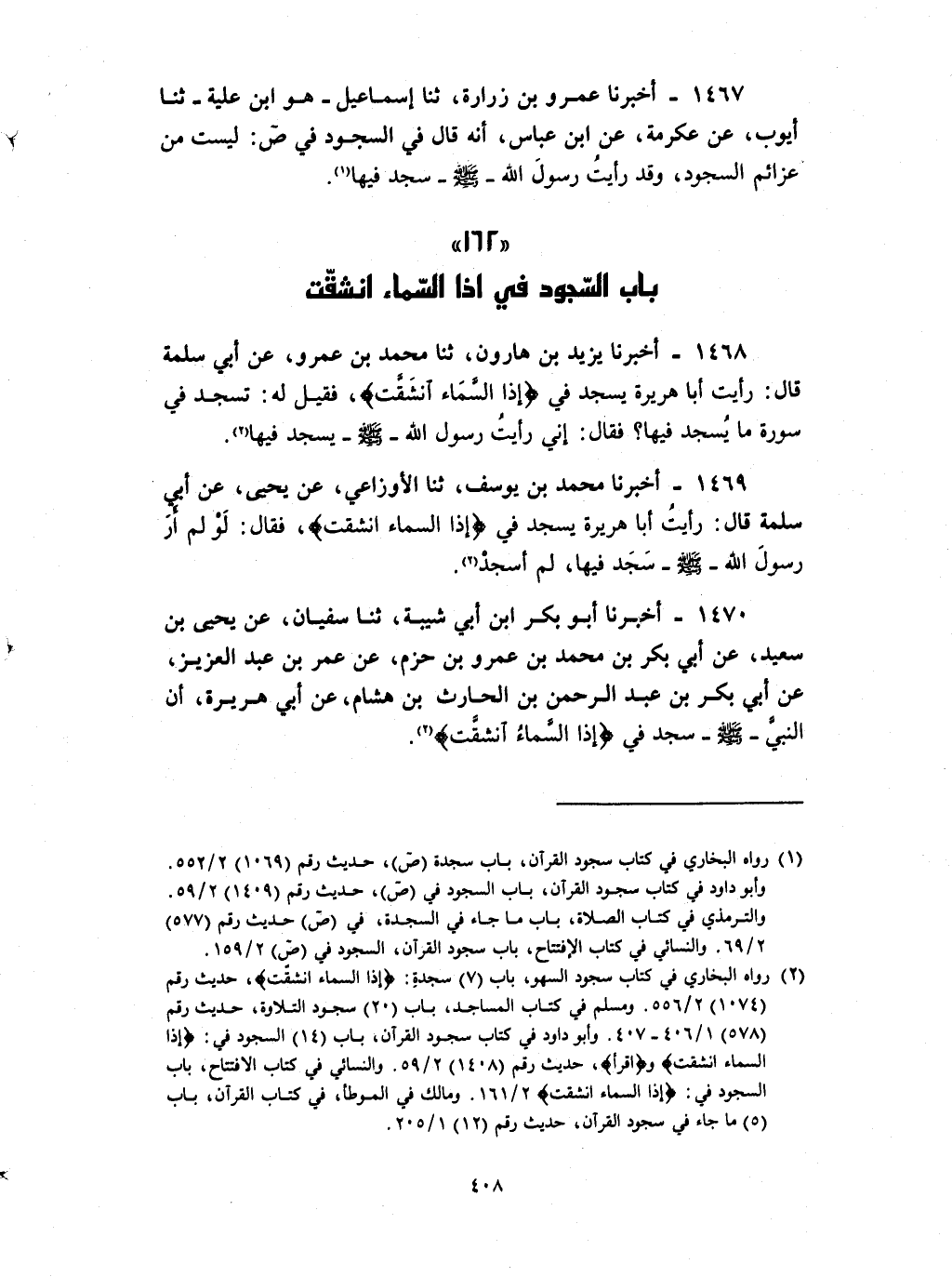 1470 - أخبرنا أبو بكر بن أبي شيبة ثنا سفيان عن يحيى بن سعيد عن أبي بكر بن محمد بن عمرو بن حزم عن عمر بن عبد العزيز عن أبي بكر بن عبد الرحمن بن الحارث بن هشام عن أبي هريرة : ان النبي صلى الله عليه و سلم سجد في إذا السماء انشقت