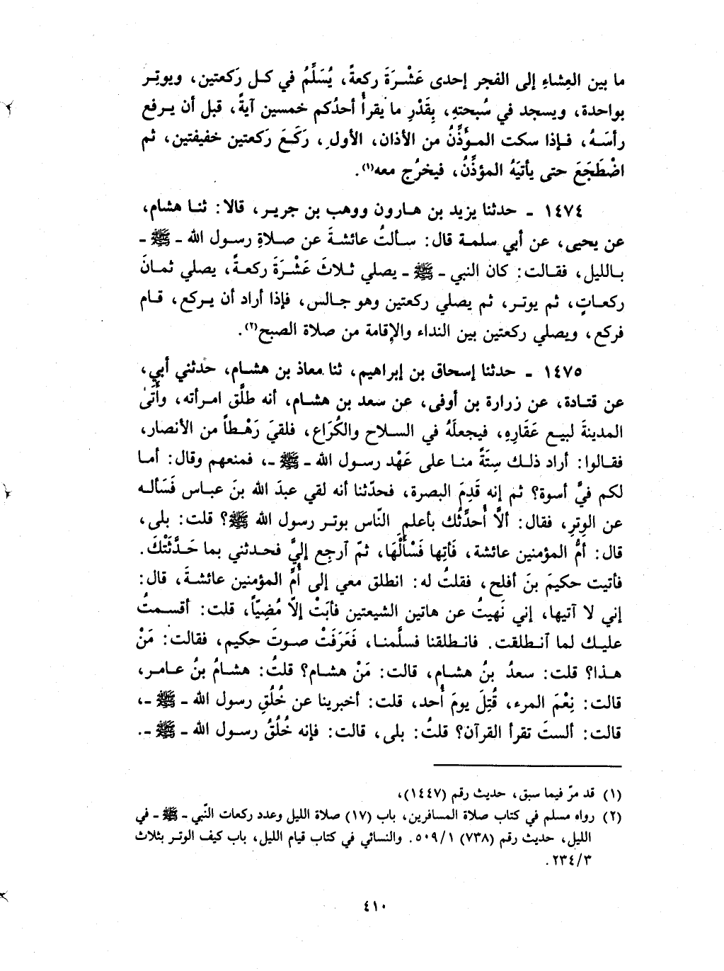 1475 - حدثنا إسحاق بن إبراهيم ثنا معاذ بن هشام حدثني أبي عن قتادة عن زرارة بن أوفى عن سعد بن هشام : انه طلق امرأته وأتى المدينة لبيع عقاره فيجعله في السلاح والكراع فلقي رهطا من الأنصار فقالوا أراد ذلك ستة منا على عهد رسول الله صلى الله عليه و سلم فمنعهم وقال آمالكم في أسوة ثم انه قدم البصرة فحدثنا انه لقي عبد الله بن عباس فسأله عن الوتر فقال الا أحدثك بأعلم الناس بوتر رسول الله صلى الله عليه و سلم قلت بلى قال أم المؤمنين عائشة فأتها فاسألها ثم أرجع إلي فحدثني بما حدثتك فأتيت حكيم بن أفلح فقلت له انطلق معي إلى أم المؤمنين عائشة قال اني لا آتيها اني نهيت عن هاتين الشيعتين فأبت الا مضيا قلت أقسمت عليك لما انطلقت فانطلقنا فسلمنا فعرفت صوت حكيم فقالت من هذا قلت سعد بن هشام قالت من هشام قلت هشام بن عامر قالت نعم المرء قتل يوم أحد قلت أخبرينا عن خلق رسول الله صلى الله عليه و سلم قالت ألست تقرأ القرآن قلت بلى قالت فإنه خلق رسول الله صلى الله عليه و سلم [ ص 411 ] فأردت ان أقوم ولا أسأل أحدا عن شيء حتى الحق بالله فعرض لي القيام فقلت أخبرينا عن قيام رسول الله صلى الله عليه و سلم قالت ألست تقرأ يا أيها المزمل قلت بلى قالت فإنها كانت قيام رسول الله صلى الله عليه و سلم أنزل أول السورة فقام رسول الله صلى الله عليه و سلم وأصحابه حتى انتفخت أقدامهم وحبس آخرها في السماء ستة عشر شهرا ثم أنزل فصار قيام الليل تطوعا بعد ان كان فريضة فأردت ان أقوم ولا أسأل أحدا عن شيء حتى الحق بالله فعرض لي الوتر فقلت أخبرينا عن وتر رسول الله صلى الله عليه و سلم فقالت كان رسول الله صلى الله عليه و سلم إذا نام وضع سواكه عندي فيبعثه الله لما يشاء ان يبعثه فيصلي تسع ركعات لا يجلس الا في الثامنة فيحمد الله ويدعو ربه ثم يقوم ولا يسلم حتى يجلس في التاسعة فيحمد الله ويدعو ربه ويسلم تسليمة يسمعنا ثم يصلي ركعتين وهو جالس فتلك إحدى عشرة ركعة يا بني فلما أسن وحمل اللحم صلى سبع ركعات لا يجلس الا في السادسة فيحمد الله ويدعو ربه ثم يقوم ولا يسلم ثم يجلس في السابعة فيحمد الله ويدعو ربه ثم يسلم تسليمة ثم يصلي ركعتين وهو جالس فتلك تسع يا بني وكان النبي صلى الله عليه و سلم إذا غلبه نوم أو مرض صلى من النهار ثنتي عشرة ركعة وكان رسول الله صلى الله عليه و سلم إذا أخذ خلقا أحب ان يداوم عليه وما قام نبي الله صلى الله عليه و سلم ليلة حتى يصبح ولا قرأ القرآن كله في ليلة ولا صام شهرا كاملا غير رمضان فأتيت بن عباس فحدثته فقال صدقتك أما اني لو كنت أدخل عليها لشافهتها مشافهة قال فقلت أما اني لو شعرت انك لا تدخل عليها ما حدثتك