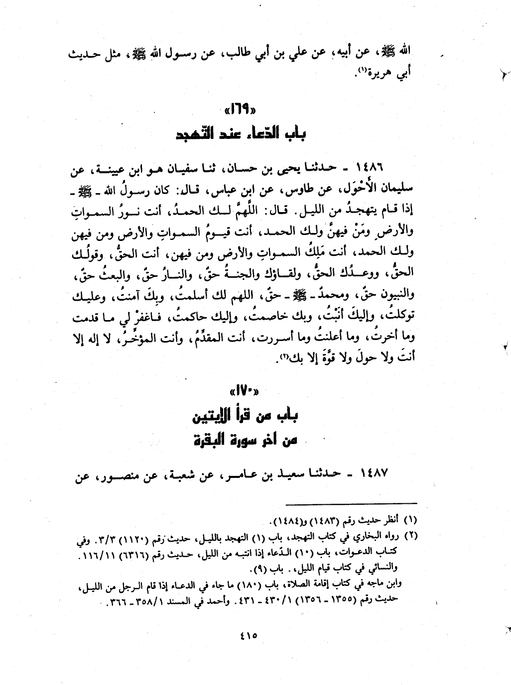 1486 - حدثنا يحيى بن حسان ثنا سفيان هو بن عيينة عن سليمان الأحول عن طاوس عن بن عباس قال : كان رسول الله صلى الله عليه و سلم إذا قام يتهجد من الليل قال اللهم لك الحمد أنت نور السماوات والأرض ومن فيهن ولك الحمد أنت قيوم السماوات والأرض ومن فيهن ولك الحمد أنت ملك السماوات والأرض ومن فيهن أنت الحق وقولك الحق ووعدك الحق ولقاؤك والجنة حق والنار حق والبعث حق والنبيون حق ومحمد صلى الله عليه و سلم حق اللهم لك أسلمت وبك آمنت وعليك توكلت وإليك أنبت وبك خاصمت وإليك حاكمت فاغفر لي ما قدمت وما أخرت وما أعلنت وما أسررت أنت المقدم وأنت المؤخر لا إله الا أنت ولا حول ولا قوة الا بك
