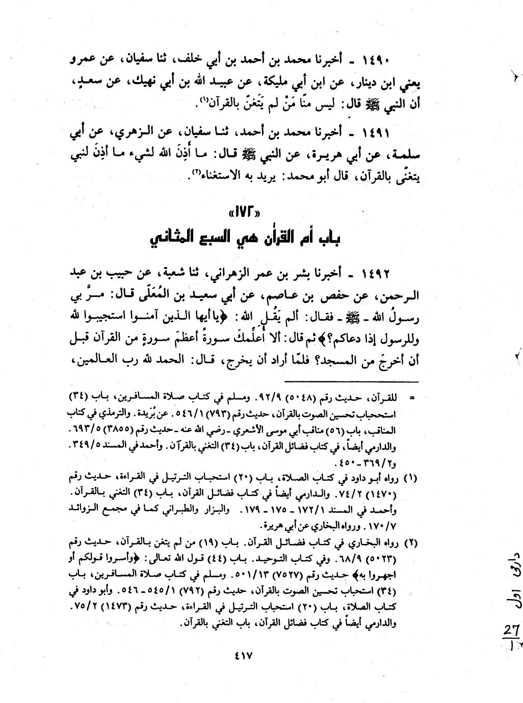 1491 - أخبرنا محمد بن أحمد ثنا سفيان عن الزهري عن أبي سلمة عن أبي هريرة عن النبي صلى الله عليه و سلم قال : ما أذن الله لشيء ما أذن لنبي يتغنى بالقرآن قال أبو محمد يريد به الاستغناء