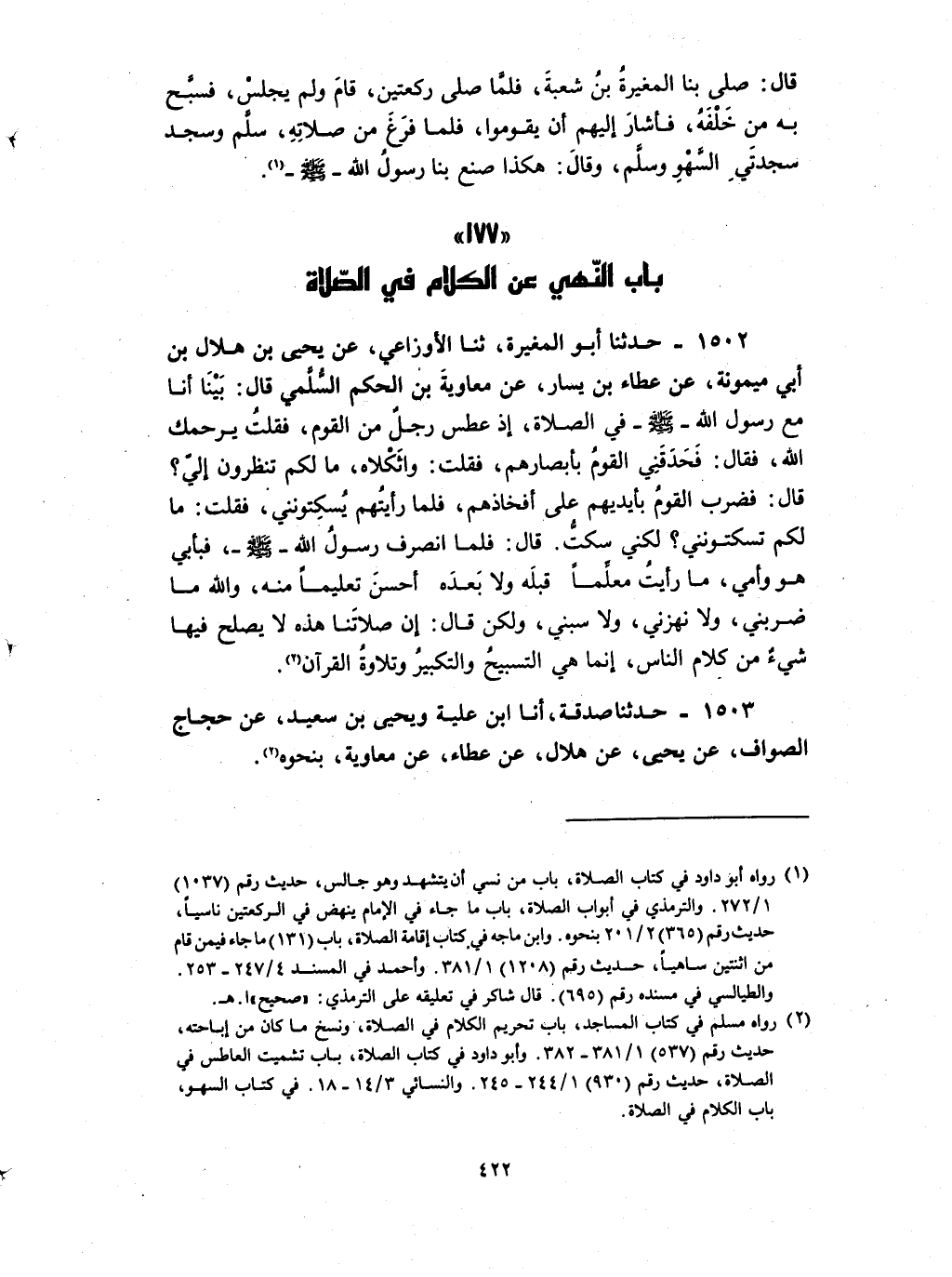 1502 - حدثنا أبو المغيرة ثنا الأوزاعي عن يحيى بن هلال بن أبي ميمونة عن عطاء بن يسار عن معاوية بن الحكم السلمي قال : بينا انا مع رسول الله صلى الله عليه و سلم في الصلاة إذ عطس رجل من القوم فقلت يرحمك الله فقال فحدقني القوم بأبصارهم فقلت وا ثكلاه ما لكم تنظرون إلي قال فضرب القوم بأيديهم على أفخاذهم فلما رأيتهم يسكتونني قلت ما لكم تسكتونني لكني سكت قال فلما انصرف رسول الله صلى الله عليه و سلم فبأبي هو وأمي ما رأيت معلما قبله ولا بعده أحسن تعليما منه والله ما ضربني ولا نهزني ولا سبني ولكن قال إن صلاتنا هذه لا يصلح فيها شيء من كلام الناس إنما هي التسبيح والتكبير وتلاوة القرآن