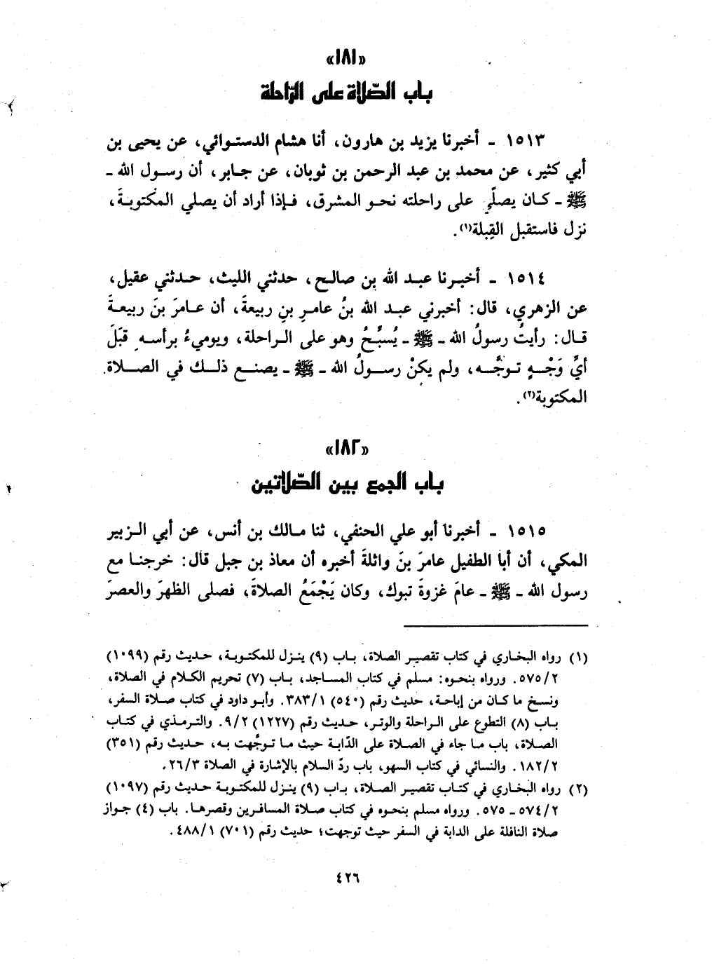 1513 - أخبرنا يزيد بن هارون انا هشام الدستوائي عن يحيى بن أبي كثير عن محمد بن عبد الرحمن بن ثوبان عن جابر : أن رسول الله صلى الله عليه و سلم كان يصلي على راحلته نحو المشرق فإذا أراد أن يصلي المكتوبة نزل فاستقبل القبلة
