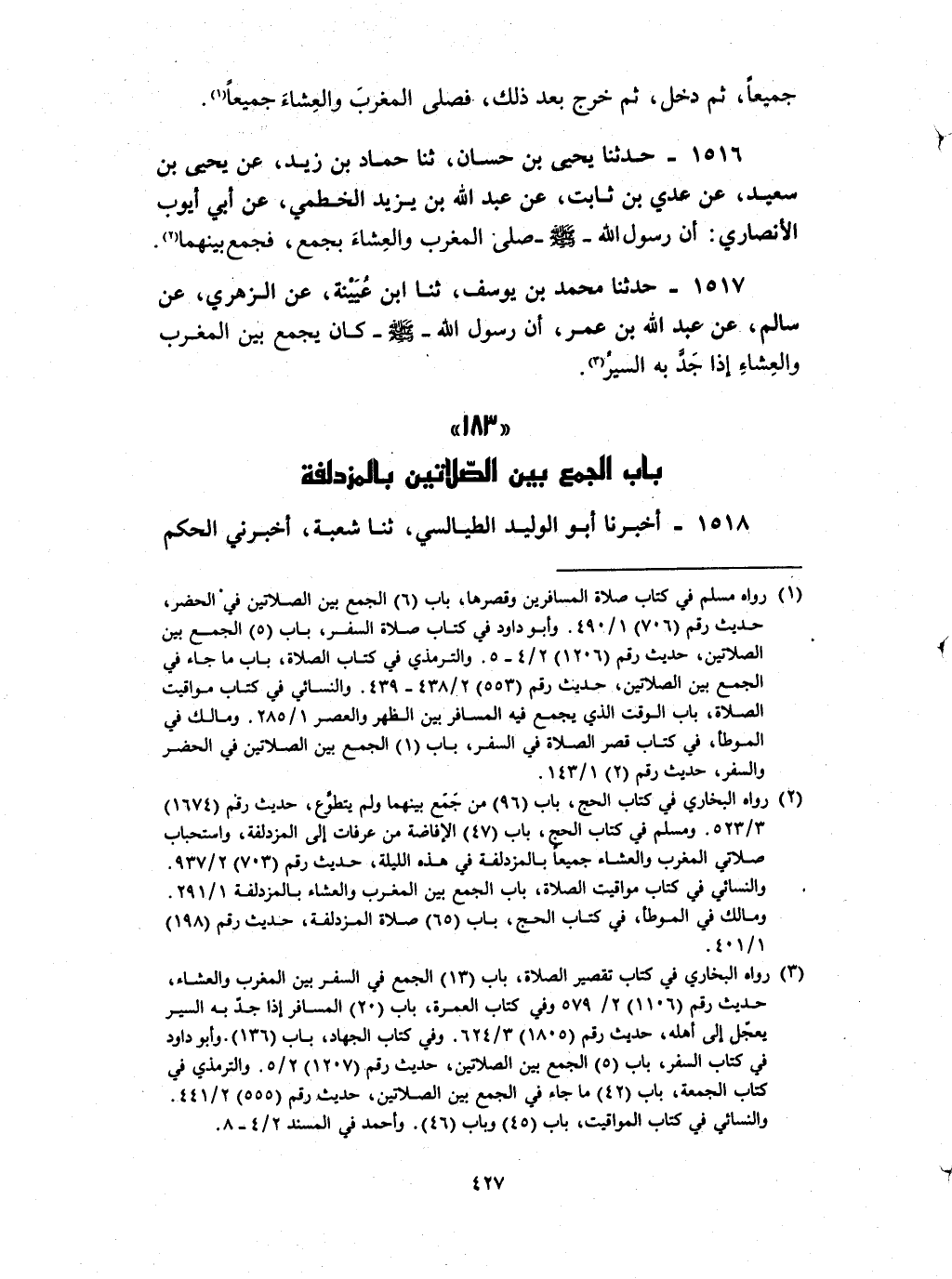 1518 - أخبرنا أبو الوليد الطيالسي ثنا شعبة أخبرني الحكم وسلمة بن كهيل قالا : صلى بنا سعيد بن جبير بجمع بإقامة المغرب ثلاثا فلما سلم قام فصلى ركعتين العشاء ثم حدث عن بن عمر انه صنع بهم في ذلك المكان مثل ذلك وحدث بن عمر ان رسول الله صلى الله عليه و سلم صنع في ذلك المكان مثل ذلك