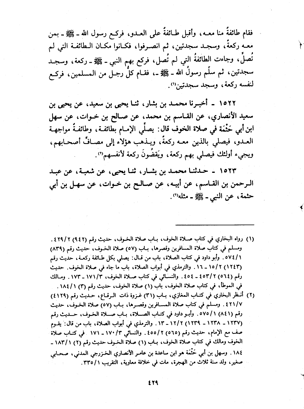 1522 - أخبرنا محمد بن بشار ثنا يحيى بن سعيد عن يحيى بن سعيد الأنصاري عن القاسم بن محمد عن صالح بن خوات عن سهل بن أبي حثمة : في صلاة الخوف قال يصلي الإمام بطائفة وطائفة مواجهة العدو فيصلي بالذين معه ركعة ويذهب هؤلاء إلى مصاف أصحابهم ويجيء أولئك فيصلي بهم ركعة ويقضون ركعة لأنفسهم