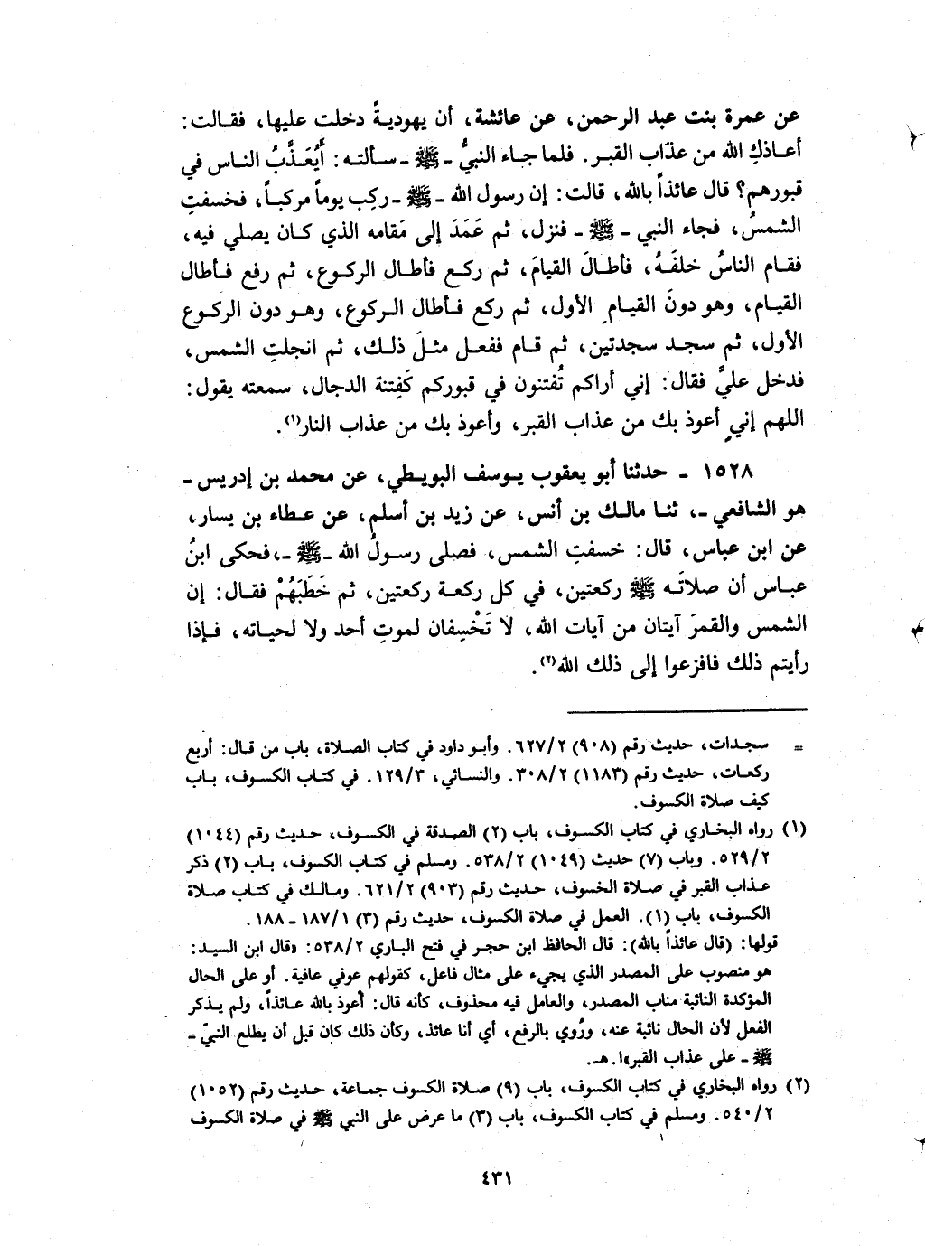 1528 - حدثنا أبو يعقوب يوسف البويطي عن محمد بن إدريس هو الشافعي ثنا مالك بن أنس عن زيد بن أسلم عن عطاء بن يسار عن بن عباس قال : خسفت الشمس فصلى رسول الله صلى الله عليه و سلم فحكى بن عباس ان صلاته صلى الله عليه و سلم ركعتين في كل ركعة ركعتين ثم خطبهم فقال ان الشمس والقمر آيتان من آيات الله لا يخسفان لموت أحد ولا لحياته فإذا رأيتم ذلك فافزعوا إلى ذلك الله