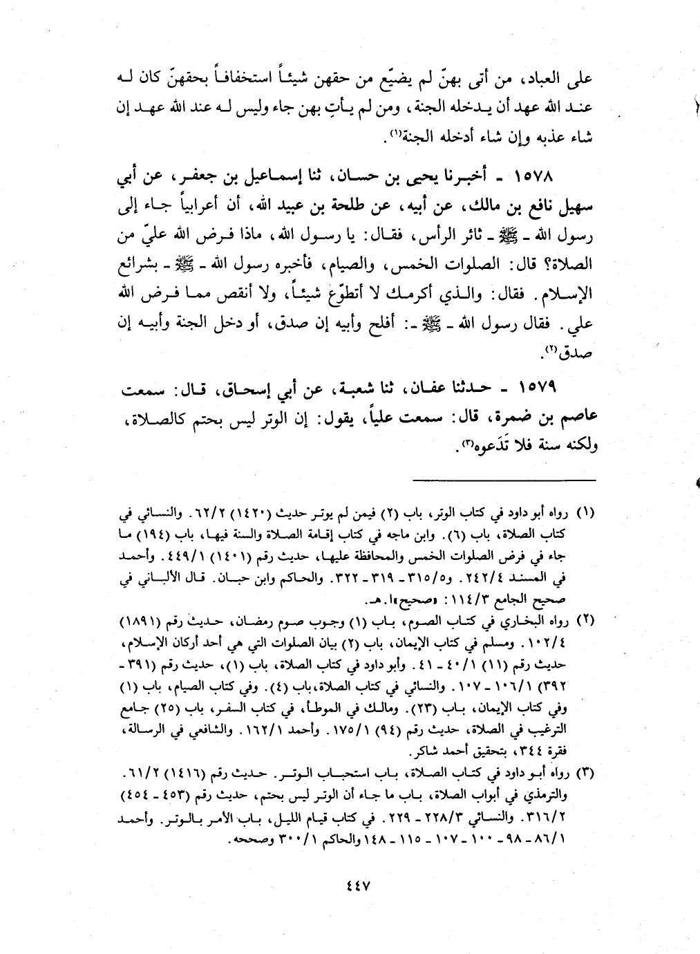 1578 - أخبرنا يحيى بن حسان ثنا إسماعيل بن جعفر عن أبي سهيل نافع بن مالك عن أبيه عن طلحة بن عبيد الله : أن أعرابيا جاء إلى رسول الله صلى الله عليه و سلم ثائر الرأس فقال يا رسول الله ماذا فرض الله علي من الصلاة قال الصلوات الخمس والصيام فأخبره رسول الله صلى الله عليه و سلم بشرائع الإسلام فقال والذي أكرمك لا أتطوع شيئا ولا أنقص مما فرض الله علي فقال رسول الله صلى الله عليه و سلم أفلح وأبيه إن صدق أو دخل الجنة وأبيه إن صدق
