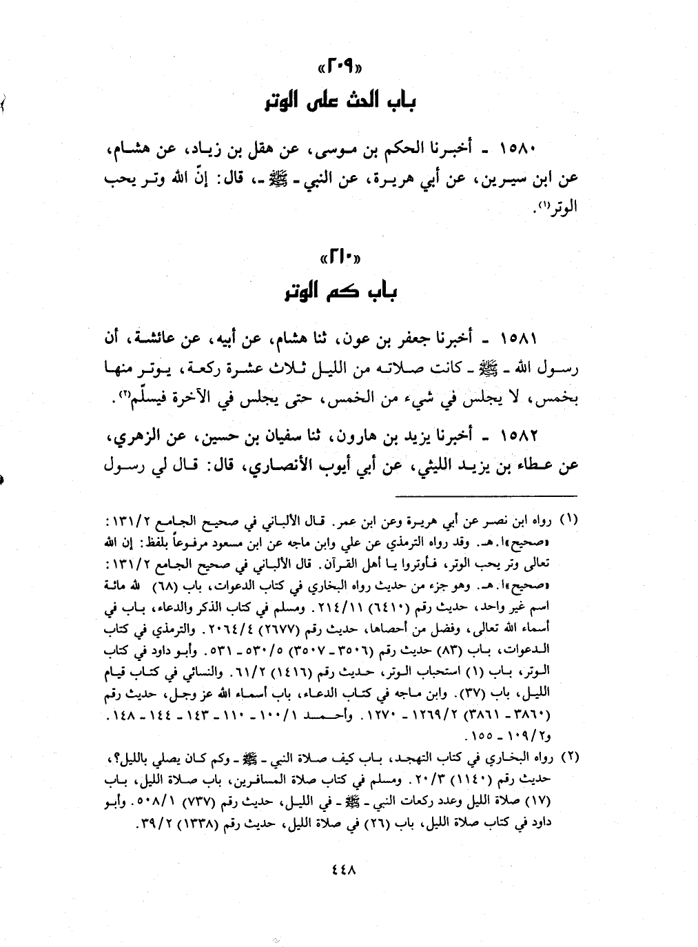 1580 - أخبرنا الحكم بن موسى عن هقل بن زياد عن هشام عن بن سيرين عن أبي هريرة عن النبي صلى الله عليه و سلم قال : إن الله وتر يحب الوتر