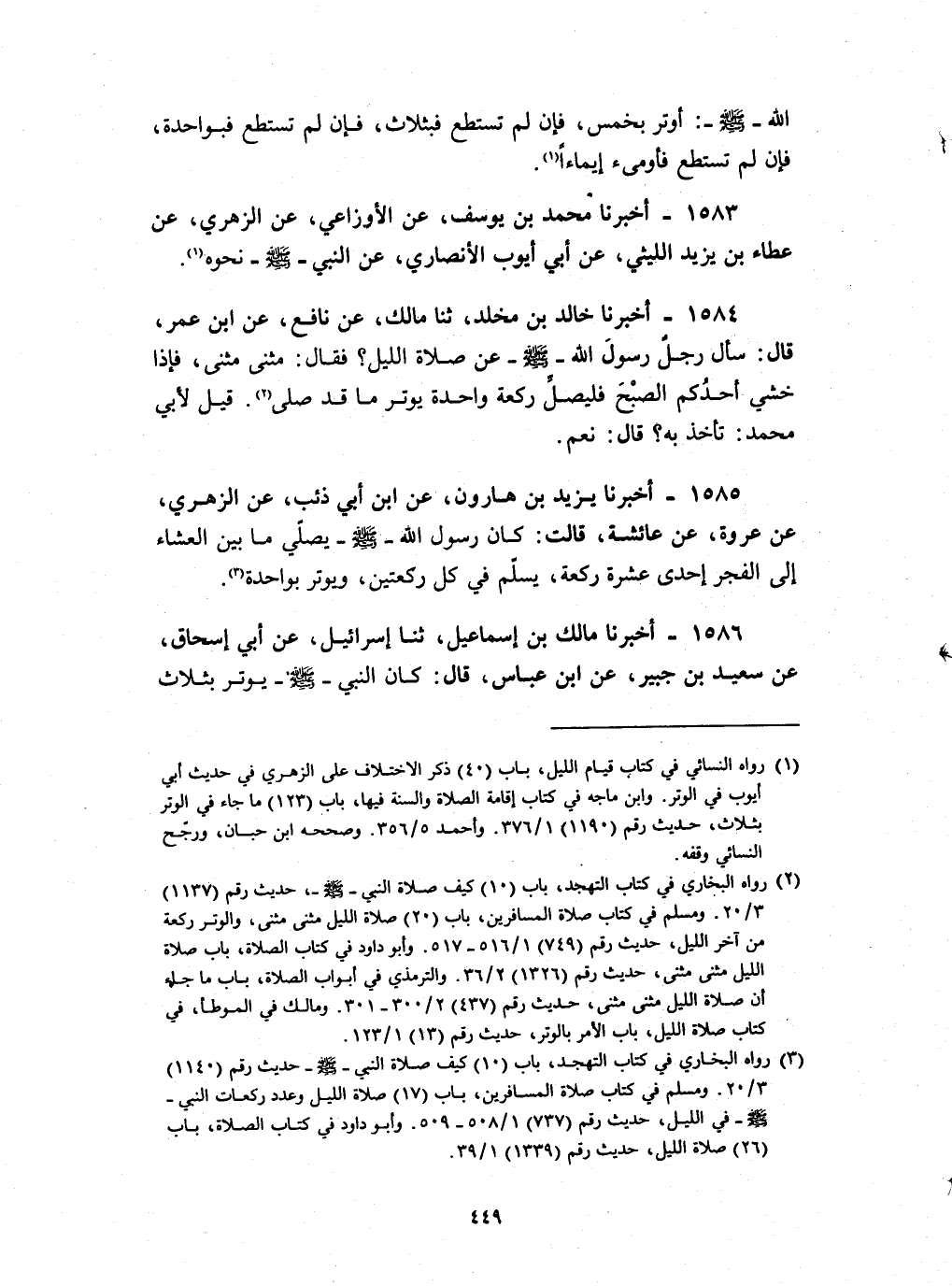 1586 - أخبرنا مالك بن إسماعيل ثنا إسرائيل عن أبي إسحاق عن سعيد بن جبير عن بن عباس قال : كان النبي صلى الله عليه و سلم يوتر بثلاث بسبح اسم ربك الأعلى وقل يا أيها الكافرون وقل هو الله أحد