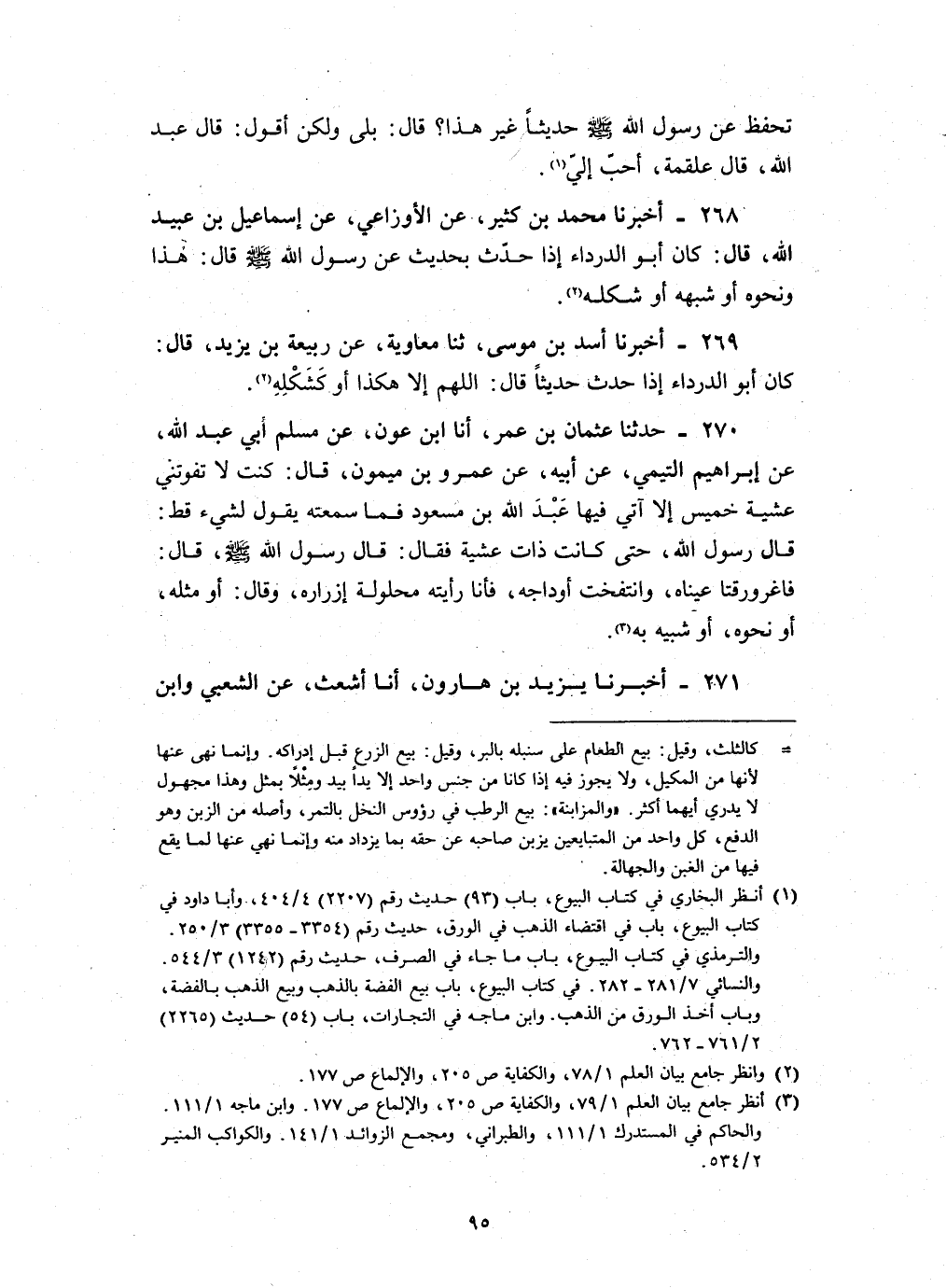 268 - أخبرنا محمد بن كثير عن الأوزاعي عن إسماعيل بن عبيد الله قال : كان أبو الدرداء إذا حدث بحديث عن رسول الله صلى الله عليه و سلم قال هذا ونحوه أو شبهه أو شكله
