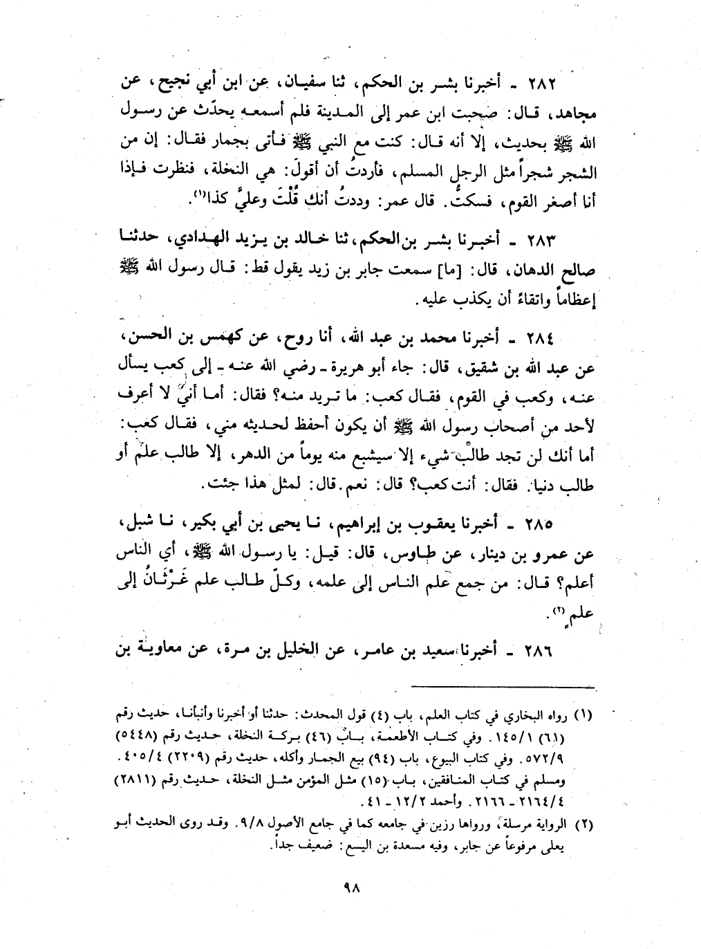 284 - أخبرنا محمد بن عبد الله انا روح عن كهمس بن الحسن عن عبد الله بن شقيق قال : جاء أبو هريرة رضي الله عنه إلى كعب يسأل عنه وكعب في القوم فقال كعب ما تريد منه فقال أما اني لا أعرف لأحد من أصحاب رسول الله صلى الله عليه و سلم ان يكون أحفظ لحديثه مني فقال كعب أما انك لن تجد طالب شيء الا سيشبع منه يوما من الدهر الا طالب علم أو طالب دنيا فقال أنت كعب قال نعم قال لمثل هذا جئت