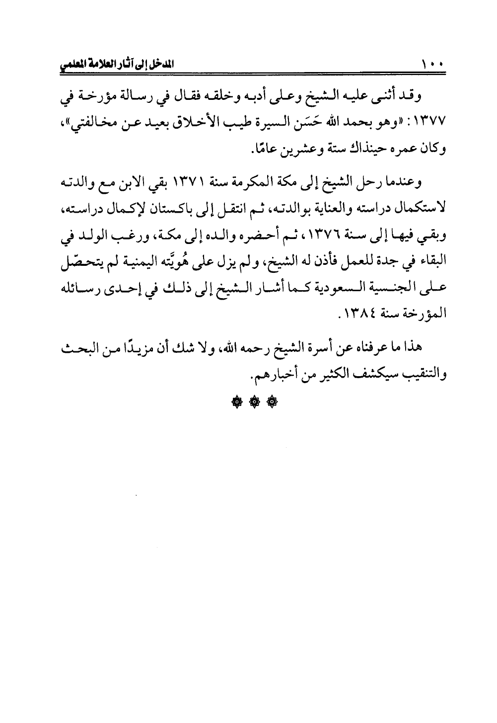 وقد أثنى عليه الشيخ وعلى أدبه وخلقه فقال في رسالة مؤرخة في ١٣٧٧: "وهو بحمد الله حَسَن السيرة طيب الأخلاق بعيد عن مخالفتي"، وكان عمره حينذاك ستة وعشرين عامًا.