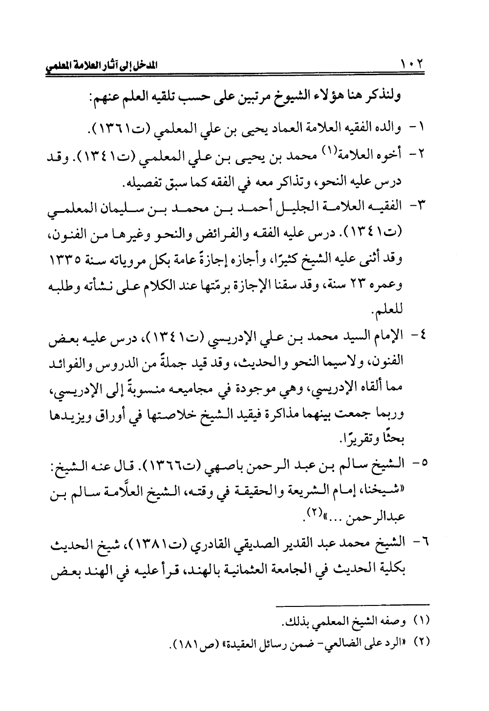 ٢ - أخوه العلامة (¬١) محمد بن يحيى بن علي المعلمي (ت ١٣٤١). وقد درس عليه النحو، وتذاكر معه في الفقه كما سبق تفصيله.