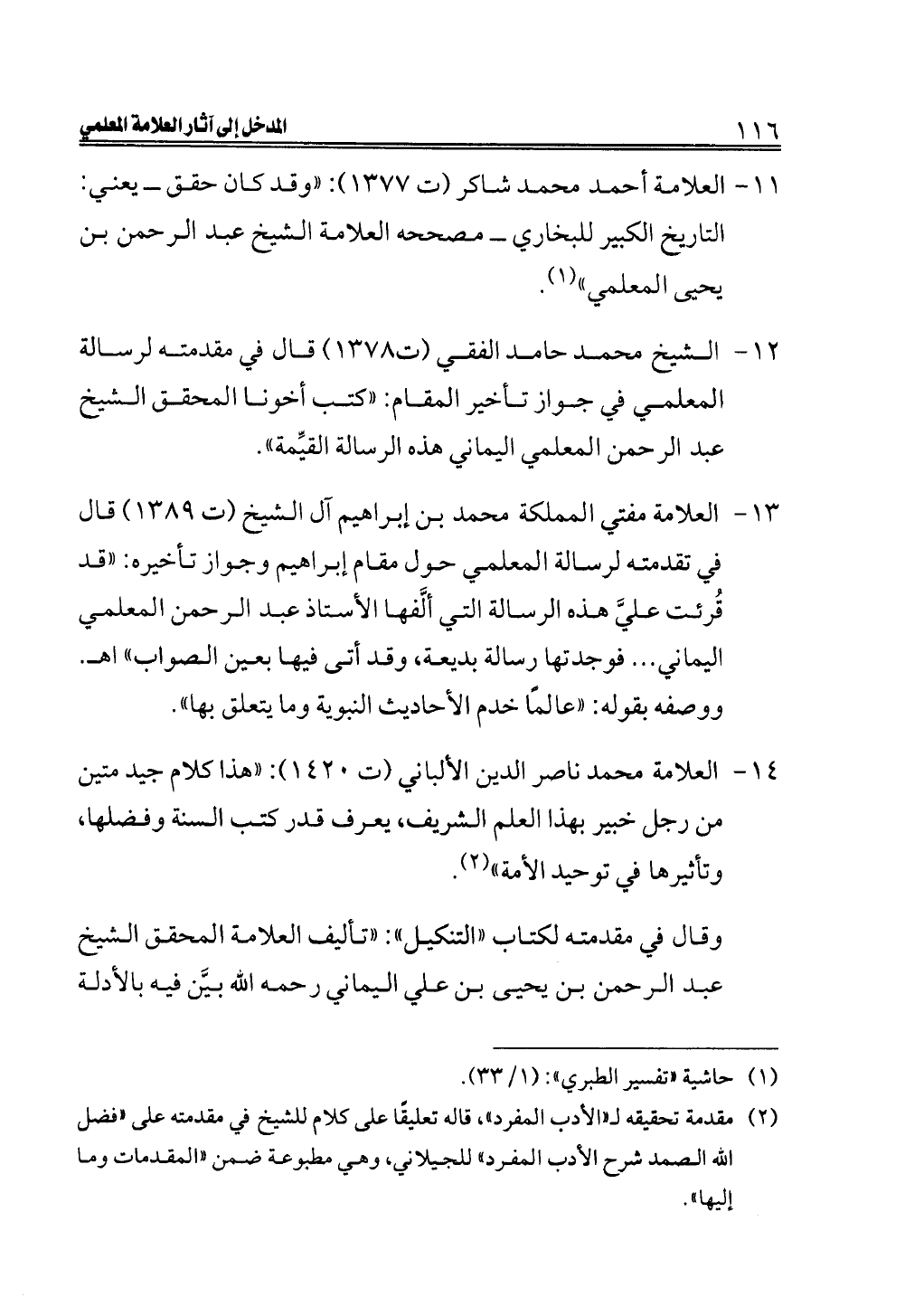 ١١ - العلامة أحمد محمد شاكر (ت ١٣٧٧): "وقد كان حقق ــ يعني: التاريخ الكبير للبخاري ــ مصححه العلامة الشيخ عبد الرحمن بن يحيى المعلمي" (¬١).