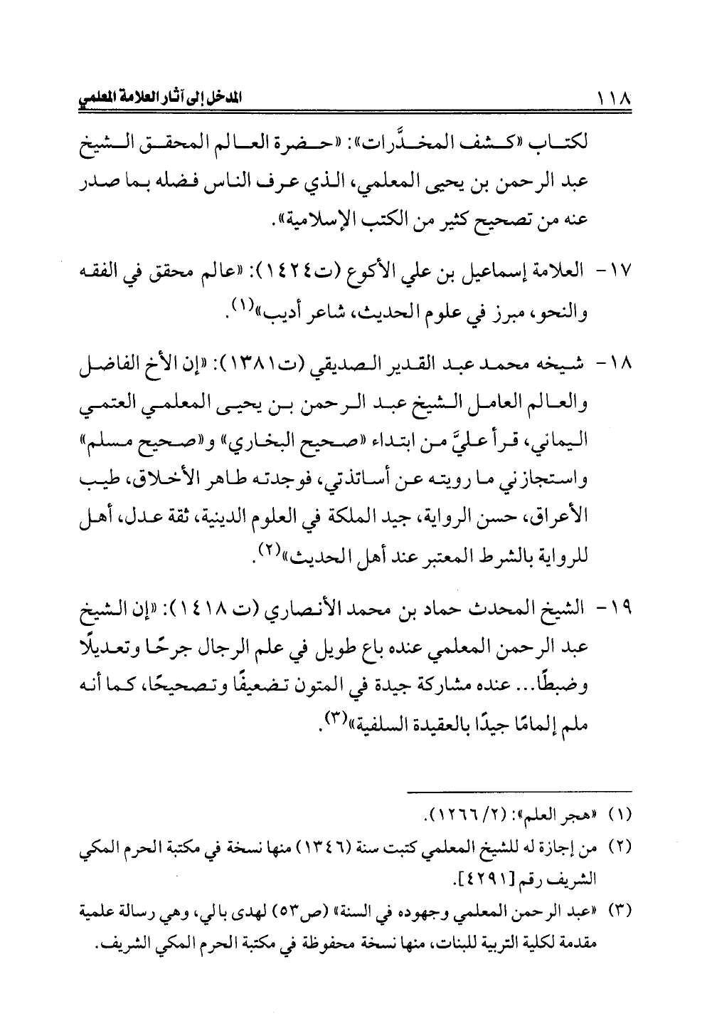 (¬٣) "عبد الرحمن المعلمي وجهوده في السنة" (ص ٥٣) لهدى بالي، وهي رسالة علمية مقدمة لكلية التربية للبنات، منها نسخة محفوظة في مكتبة الحرم المكي الشريف.