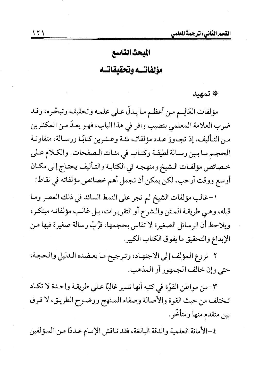 مؤلفات العَالِم من أعظم ما يدلّ على علمه وتحقيقه وتبحّره، وقد ضرب العلامة المعلمي بنصيب وافر في هذا الباب، فهو يعدّ من المكثرين من التأليف، إذ تجاوز عدد مؤلفاته مئة وعشرين كتابًا ورسالة، متفاوتة الحجم ما بين رسالة لطيفة وكتاب في مئات الصفحات. والكلام على خصائص مؤلفات الشيخ ومنهجه في الكتابة والتأليف يحتاج إلى مكان أوسع ووقت أرحب، لكن يمكن أن نجمل أهم خصائص مؤلفاته في نقاط: