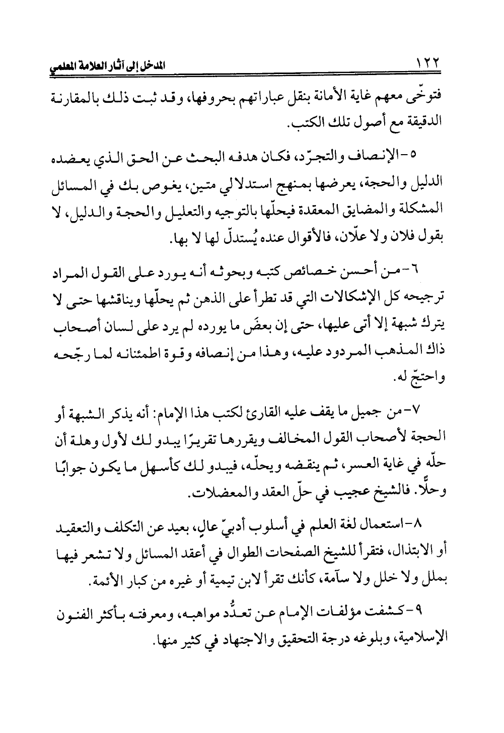 ٨ - استعمال لغة العلم في أسلوب أدبيّ عالٍ، بعيد عن التكلف والتعقيد أو الابتذال، فتقرأ للشيخ الصفحات الطوال في أعقد المسائل ولا تشعر فيها بملل ولا خلل ولا سآمة، كأنك تقرأ لابن تيمية أو غيره من كبار الأئمة.