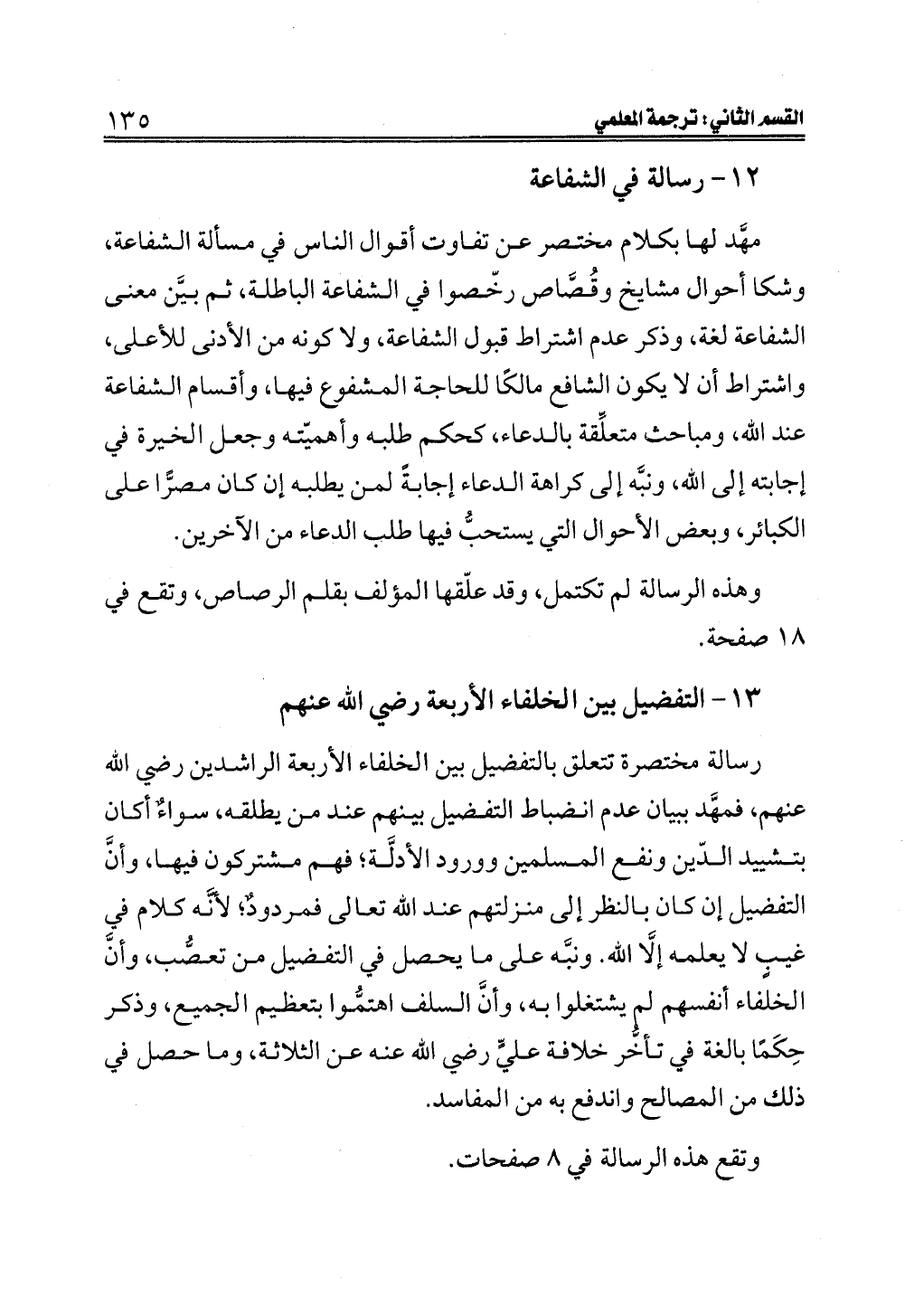 رسالة مختصرة تتعلق بالتفضيل بين الخلفاء الأربعة الراشدين رضي الله عنهم، فمهَّد ببيان عدم انضباط التفضيل بينهم عند من يطلقه، سواءٌ أكان بتشييد الدّين ونفع المسلمين وورود الأدلَّة؛ فهم مشتركون فيها، وأنَّ التفضيل إن كان بالنظر إلى منزلتهم عند الله تعالى فمردودٌ؛ لأنَّه كلام في غيبٍ لا يعلمه إلَّا الله. ونبَّه على ما يحصل في التفضيل من تعصُّب، وأنَّ الخلفاء أنفسهم لم يشتغلوا به، وأنَّ السلف اهتمُّوا بتعظيم الجميع، وذكر حِكَمًا بالغة في تأخُّر خلافة عليٍّ رضي الله عنه عن الثلاثة، وما حصل في ذلك من المصالح واندفع به من المفاسد.