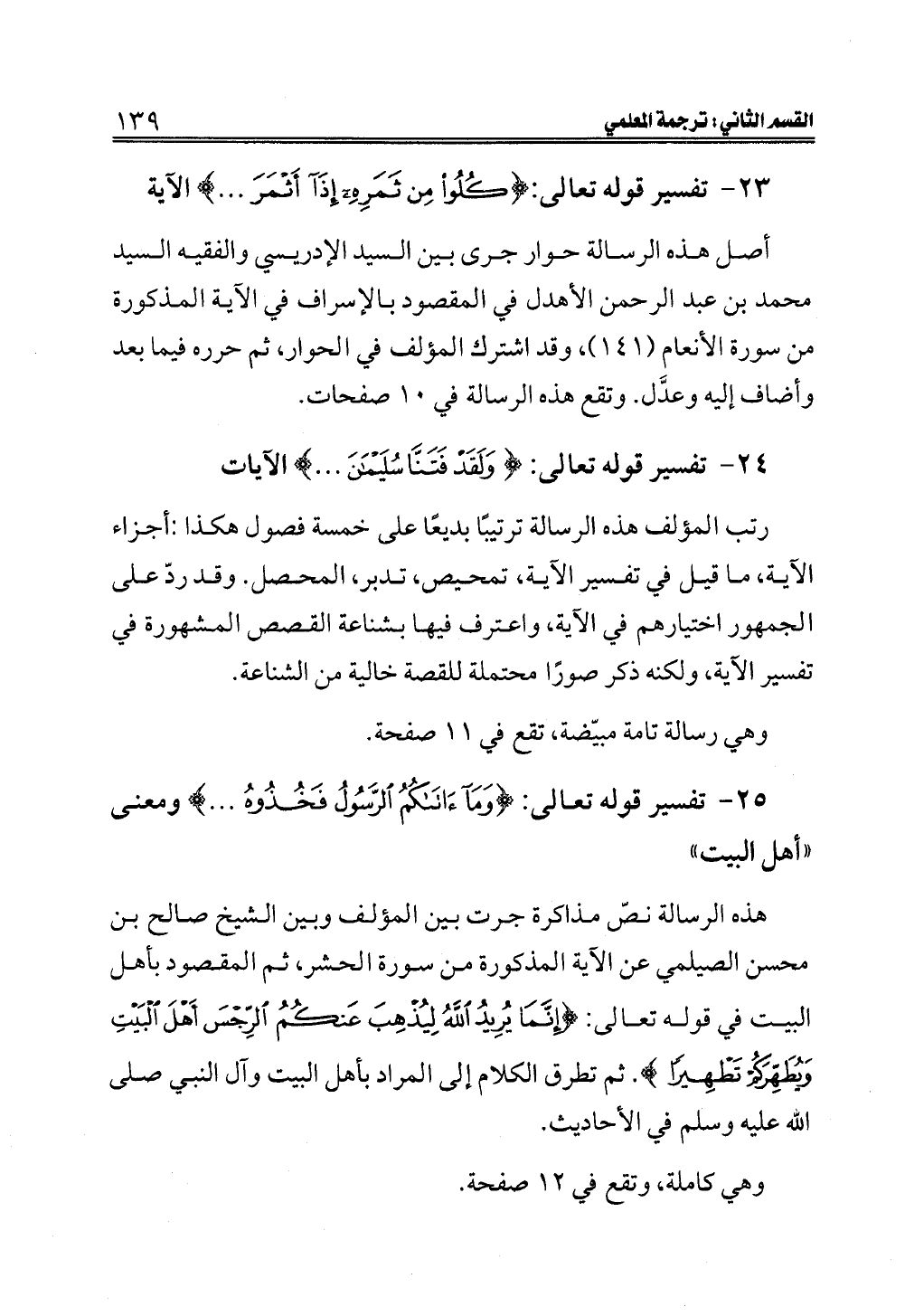 هذه الرسالة نصّ مذاكرة جرت بين المؤلف وبين الشيخ صالح بن محسن الصيلمي عن الآية المذكورة من سورة الحشر، ثم المقصود بأهل البيت في قوله تعالى: {إِنَّمَا يُرِيدُ اللَّهُ لِيُذْهِبَ عَنْكُمُ الرِّجْسَ أَهْلَ الْبَيْتِ وَيُطَهِّرَكُمْ تَطْهِيرًا}. ثم تطرق الكلام إلى المراد بأهل البيت وآل النبي صلى الله عليه وسلم في الأحاديث.
