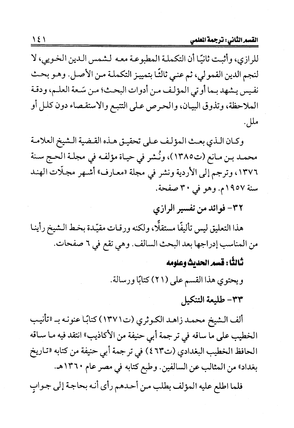 للرازي، وأثبت ثانيًا أن التكملة المطبوعة معه لشمس الدين الخويي، لا لنجم الدين القمولي، ثم عني ثالثًا بتمييز التكملة من الأصل. وهو بحث نفيس يشهد بما أوتي المؤلف من أدوات البحث؛ من سَعة العلم، ودقة الملاحظة، وتذوق البيان، والحرص على التتبع والاستقصاء دون كلل أو ملل.