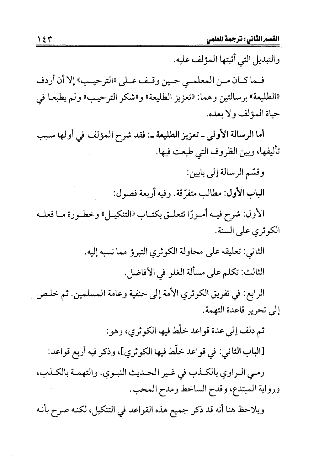 الأول: شرح فيه أمورًا تتعلق بكتاب "التنكيل" وخطورة ما فعله الكوثري على السنة.
