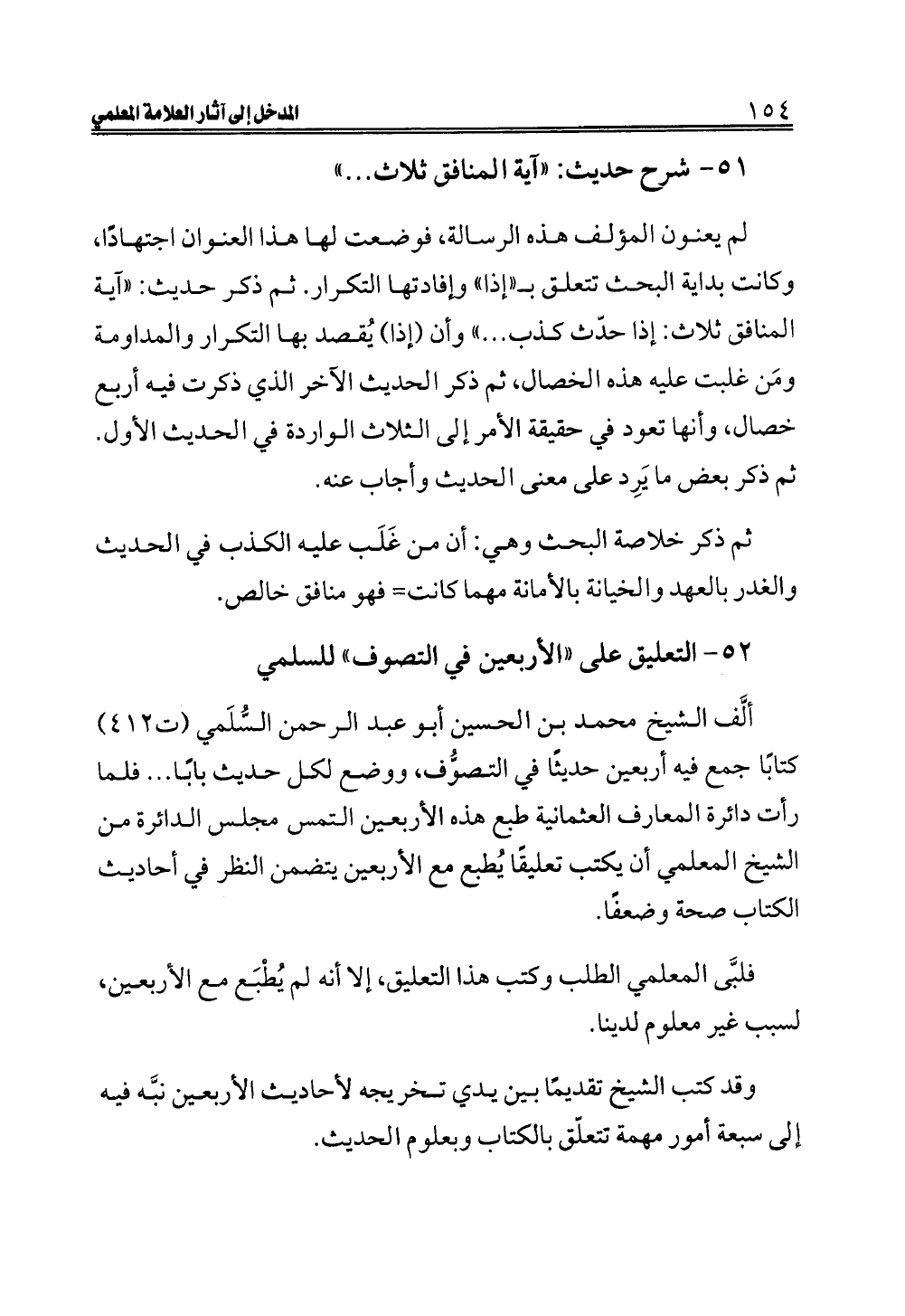 ألَّف الشيخ محمد بن الحسين أبو عبد الرحمن السُّلَمي (ت ٤١٢) كتابًا جمع فيه أربعين حديثًا في التصوُّف، ووضع لكل حديث بابًا ... فلما رأت دائرة المعارف العثمانية طبع هذه الأربعين التمس مجلس الدائرة من الشيخ المعلمي أن يكتب تعليقًا يُطبع مع الأربعين يتضمن النظر في أحاديث الكتاب صحة وضعفًا.