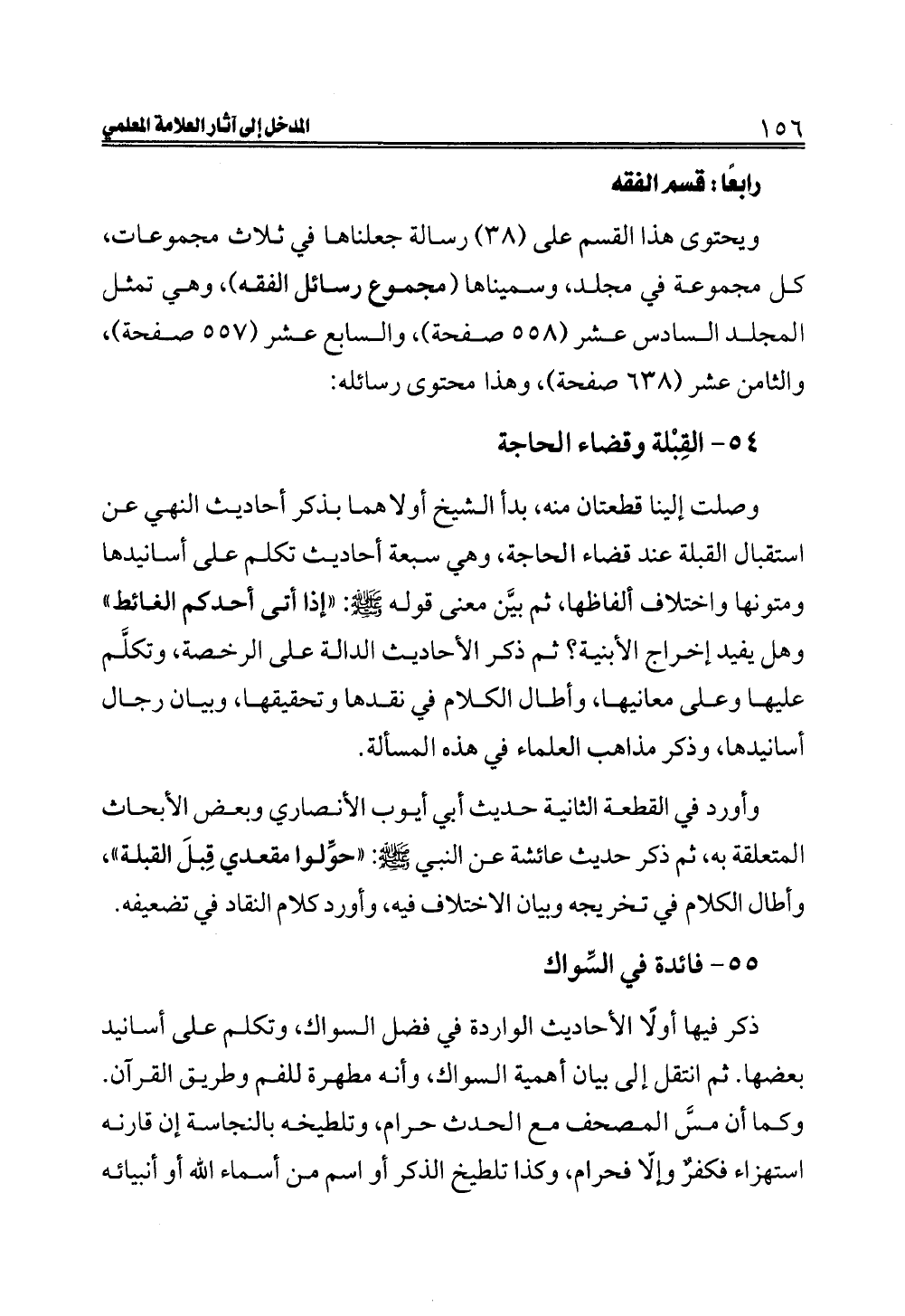 وصلت إلينا قطعتان منه، بدأ الشيخ أولاهما بذكر أحاديث النهي عن استقبال القبلة عند قضاء الحاجة، وهي سبعة أحاديث تكلم على أسانيدها ومتونها واختلاف ألفاظها، ثم بيَّن معنى قوله - صلى الله عليه وسلم -: "إذا أتى أحدكم الغائط" وهل يفيد إخراج الأبنية؟ ثم ذكر الأحاديث الدالة على الرخصة، وتكلَّم عليها وعلى معانيها، وأطال الكلام في نقدها وتحقيقها، وبيان رجال أسانيدها، وذكر مذاهب العلماء في هذه المسألة.