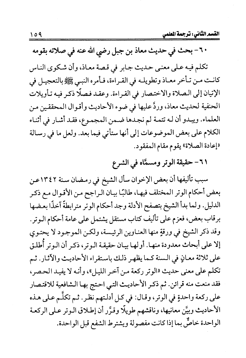 تكلم فيه على معنى حديث جابر في قصة معاذ، وأن شكوى الناس كانت من تأخر معاذ وتطويله في القراءة، فأمره النبي - صلى الله عليه وسلم - بالتعجيل في الإتيان إلى الصلاة والاختصار في القراءة. وعقد فصلًا ذكر فيه تأويلات الحنفية لحديث معاذ، وردَّ عليها في ضوء الأحاديث وأقوال المحققين من العلماء. ويبدو أن له تتمة لم نجدها ضمن المجموع، فقد أشار في أثناء الكلام على بعض الموضوعات إلى أنها ستأتي فيما بعد. ولعل ما في رسالة "إعادة الصلاة" يقوم مقام المفقود.