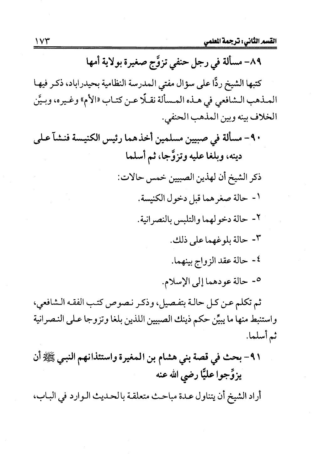 كتبها الشيخ ردًّا على سؤال مفتي المدرسة النظامية بحيدراباد، ذكر فيها المذهب الشافعي في هذه المسألة نقلًا عن كتاب "الأم" وغيره، وبيَّن الخلاف بينه وبين المذهب الحنفي.