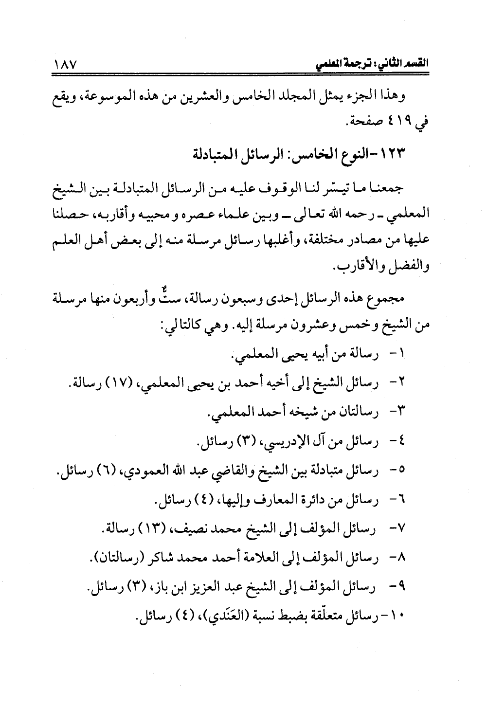 جمعنا ما تيسّر لنا الوقوف عليه من الرسائل المتبادلة بين الشيخ المعلمي ــ رحمه الله تعالى ــ وبين علماء عصره ومحبيه وأقاربه، حصلنا عليها من مصادر مختلفة، وأغلبها رسائل مرسلة منه إلى بعض أهل العلم والفضل والأقارب.