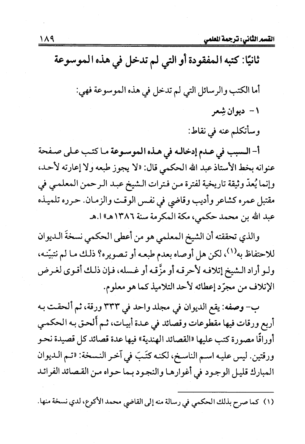 أ- السبب في عدم إدخاله في هذه الموسوعة ما كتب على صفحة عنوانه بخط الأستاذ عبد الله الحكمي قال: "لا يجوز طبعه ولا إعارته لأحد، وإنما يُعدّ وثيقة تاريخية لفترة من فترات الشيخ عبد الرحمن المعلمي في مقتبل عمره كشاعر وأديب وقاضي في نفس الوقت والزمان. حرره تلميذه عبد الله بن محمد حكمي، مكة المكرمة سنة ١٣٨٦ هـ" ا. هـ