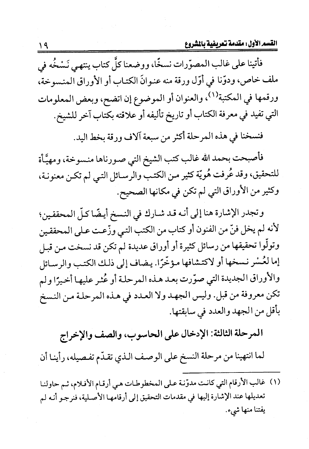 وتجدر الإشارة هنا إلى أنه قد شارك في النسخ أيضًا كلّ المحققين؛ لأنه لم يخل فنّ من الفنون أو كتاب من الكتب التي وزّعت على المحققين وتولّوا تحقيقها من رسائل كثيرة أو أوراق عديدة لم تكن قد نسخت من قبل إما لعُسْر نسخها أو لاكتشافها مؤخّرًا. يضاف إلى ذلك الكتب والرسائل والأوراق الجديدة التي صوّرت بعد هذه المرحلة أو عُثر عليها أخيرًا ولم تكن معروفة من قبل. وليس الجهد ولا العدد في هذه المرحلة من النسخ بأقل من الجهد والعدد في سابقتها.