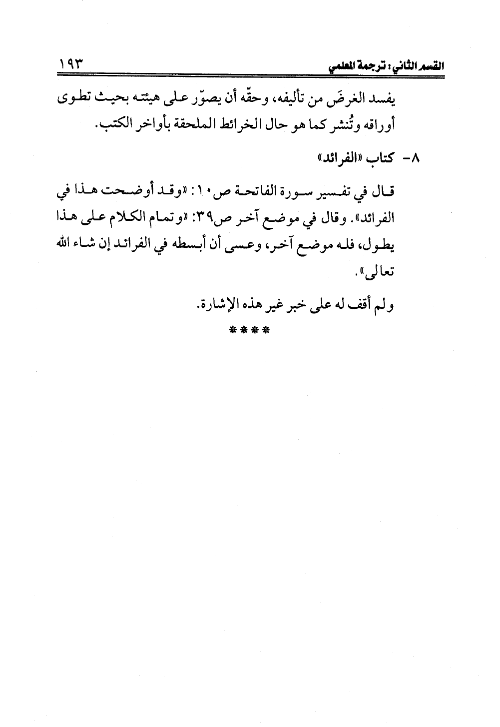 قال في تفسير سورة الفاتحة ص ١٠: "وقد أوضحت هذا في الفرائد". وقال في موضع آخر ص ٣٩: "وتمام الكلام على هذا يطول، فله موضع آخر، وعسى أن أبسطه في الفرائد إن شاء الله تعالى".