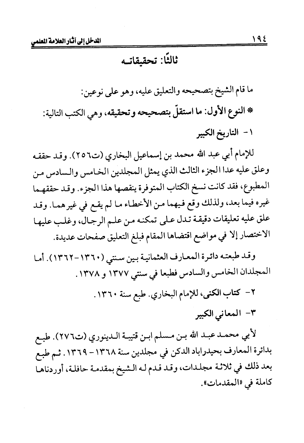 للإمام أبي عبد الله محمد بن إسماعيل البخاري (ت ٢٥٦). وقد حققه وعلق عليه عدا الجزء الثالث الذي يمثل المجلدين الخامس والسادس من المطبوع، فقد كانت نسخ الكتاب المتوفرة ينقصها هذا الجزء. وقد حققهما غيره فيما بعد، ولذلك وقع فيهما من الأخطاء ما لم يقع في غيرهما. وقد علق عليه تعليقات دقيقة تدل على تمكنه من علم الرجال، وغلب عليها الاختصار إلا في مواضع اقتضاها المقام فبلغ التعليق صفحات عديدة.