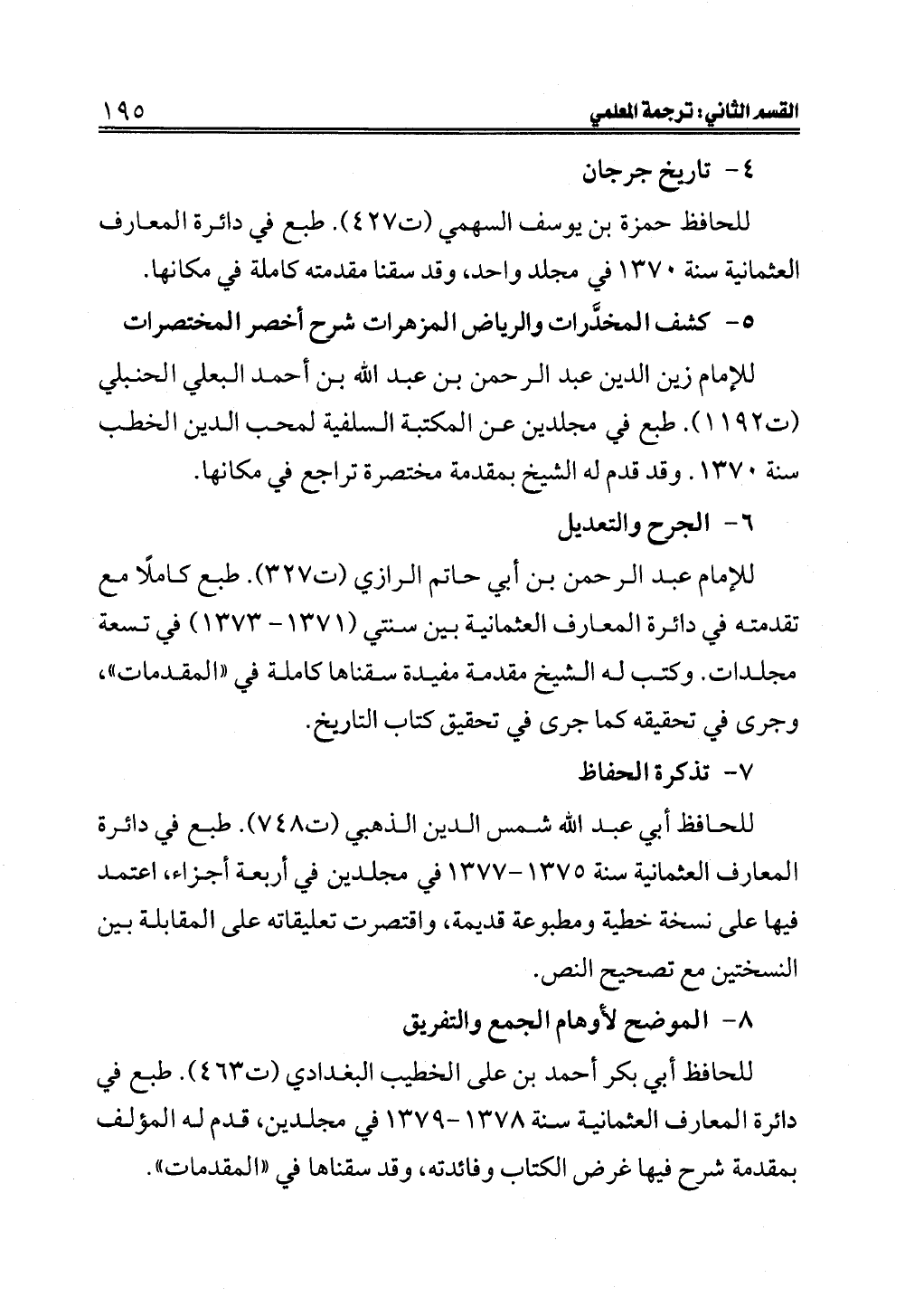 للإمام عبد الرحمن بن أبي حاتم الرازي (ت ٣٢٧). طبع كاملًا مع تقدمته في دائرة المعارف العثمانية بين سنتي (١٣٧١ - ١٣٧٣) في تسعة مجلدات. وكتب له الشيخ مقدمة مفيدة سقناها كاملة في "المقدمات"، وجرى في تحقيقه كما جرى في تحقيق كتاب التاريخ.